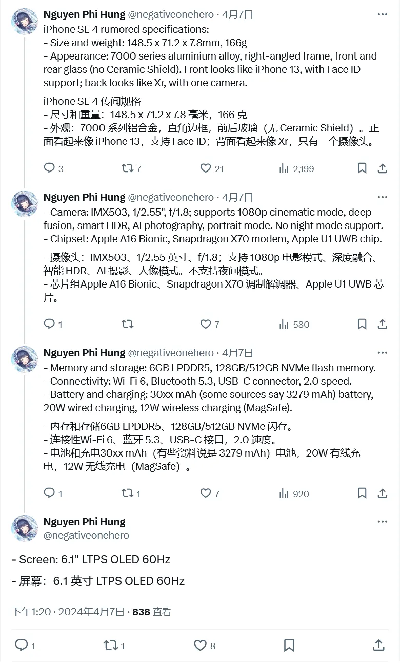 IT之家 4 月 12 日消息,消息源 Nguyen Phi Hung 克日发布系列推文,分享了苹果 iPhone SE 4 手机的具体规格参数。 苹果 iPhone SE 4 手机在计划上会迎来庞大升级,取消 Touch ID,配备刘海计划并内嵌 Face ID 办理方案,团体计划靠近于 iPhone 14。 IT之家基于推文内容汇总干系规格如下: 尺寸:148.5 x 71.2 x 7.8 毫米 重量:166 克 屏幕:6.1 英寸 LTPS OLED 60Hz 表面:7000 系列铝合金,前后玻璃(但是没有 Ceramic Shield)。正面看起来像 iPhone 13,支持 Face ID;反面看起来像 Xr,只有一个摄像头。 摄像头:IMX503、1/2.55 英寸、f / 1.8 摄像头模式:支持 1080P Cinematic 模式、Deep Fusion、Smart HDR、AI 场景拍照,肖像模式。但不支持 Night 夜间模式。 芯片:苹果 A16 Bionic 芯片,高通骁龙 X70 通讯模组、苹果 U1 UWB 芯片 内存:6GB LPDDR5 存储:128GB / 512GB NVMe 存储 毗连:Wi-Fi 6、蓝牙 5.3、USB-C 接口 2.0 速率 电池:30xx mAh 电池(部分消息源称是 3279mAh) 充电:20W 有线充电,12W 无线充电(MagSafe) |