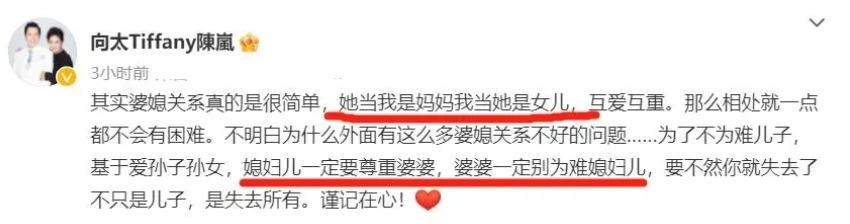 清静问向佐:“你会由于什么事故,和你的太太发生一些争论?” 向佐绝不迟疑地答复:“会讨论,但不会争论。” 清静追问:“那她是善于辩说,照旧不善于辩说的?” 向佐答复:“她很善于辩说,但她从来不会和我打骂,什么都会夸奖我、鼓励我。她是个很巨大的妈妈,也是个很巨大的女人,我一点都不介意被别人说是郭碧婷的老公。她对孩子的爱,对我的爱,对我父母的爱,对她自己父母的爱,我无可挑剔的。” 向佐突如其来的哽咽堕泪,惊呆了全场高朋,纪凌尘立刻轻抚向佐的后背,安慰他的感情。 高海宁感慨:“我第一次在他的脸上,看到有如许的心情。” 网友们也被向佐的这番真情告白所感动: 绝对是真实的!以向佐的演技,他演不出来这种感情。 爱,就是经常以为亏欠! 我在他脸上,居然看到了愧疚感。 郭碧婷的权门生存之道2019年,郭碧婷、向佐官宣恋情并完婚;2020年,女儿向芷出生;2022年,儿子向笙出生——可即便云云,依然有很多人不看好这段婚姻。 郭碧婷生二胎期间,向佐曾被张小寒、江小宴爆出了与女网红同回婚房的猛料,郭碧婷一声不响,郭碧婷的父亲则清空了个人的交际账号。 向太敏捷发布了一篇标题为《摩羯座黑化很可骇》的“小作文”,固然很快自己删除,但张小寒、江小宴全部“哑火。 如今转头再看这件事,郭碧婷的处置惩罚方式相称理智,也侧面证实白向佐的话,“她从来不会和我打骂,什么都会夸奖我、鼓励我”。 向佐不停活在父母的光环和荫蔽之下,也就意味着他必须要听父母的话。而郭碧婷也正是清晰地熟悉到这个现状,索性大方做个好老婆、好儿媳,永世给向佐提供正面的、积极的感情代价,让他越来越信托自己、依靠自己。 另一方面,郭碧婷也非常懂得与婆婆的相处之道,乖巧、听话、孝敬、娴熟,加上她本就是向太经心挑选的儿媳妇,天然备受痛爱。 向太和郭碧婷相约出门购物,秘书暂时拿了一份文件让向太签署,郭碧婷只好一个人去阛阓给宝宝买玩具。 向太忙完自己的事故,特意去花店买了一束花,送给郭碧婷以示增补。 向太还发文写道:婆媳关系真的很简朴,她当我是妈妈,我当她是女儿,互爱互重,那么相处就一点儿都不会有困难。不明确为什么有这么多婆媳关系不合的题目?媳妇儿肯定要恭敬婆婆,婆婆肯定别为难媳妇儿,要否则你失去的不但是儿子,是失去全部。 大概是受婆婆言传身教的影响,郭碧婷的举动举止,和向太越来越相似。 本年,儿女双全的郭碧婷正式复出,到场《乘风2024》,5年的权门生存,让原来气质清凉的她,平添了几分霸气。 作为权门儿媳 奚梦瑶领先郭碧婷前几日,“奚梦瑶当街谴责老公何猷君”的消息上了热搜,看到何猷君警惕翼翼哄老婆的边幅,网友挖苦:头一次看到权门公子这么憋屈。 奚梦瑶和郭碧婷的履历极为相似: 1、同样是女明星嫁入权门; 2、同样是婚姻不被吃瓜群众看好; 3、同样是拿捏住老公,乐成逆袭; 4、同样是讨得了婆婆的欢心; 5、同样是儿女双全后,可以复出娱乐圈工作。 但奚梦瑶比郭碧婷领先了一大步,由于她已经被婆婆送去香港大学读EMBA课程,意味着将徐徐继承家属的交易。 结语在《甄嬛传》里,甄嬛对华妃讲过一句经典台词:容不容得下嫔妾,是娘娘的心胸;能不能让娘娘容下,是嫔妾的本领。 嫁入权门的女明星不胜摆列,但能像奚梦瑶、郭碧婷一样短短几年就能站稳脚跟、如鱼得水的,则少之又少。 漂亮的面庞、姣好的身材,只是她们嫁入权门的“打门砖”;超高的情商和智商,哑忍的心计,良好的本领,才是她们实现阶层跃迁的真正缘故起因。 |