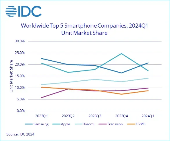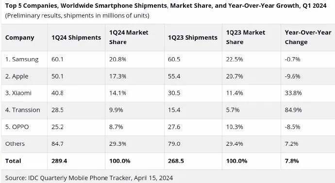 2024 年环球 Q1 智能手机出货量排名出炉,三星居首,小米大涨位列第三