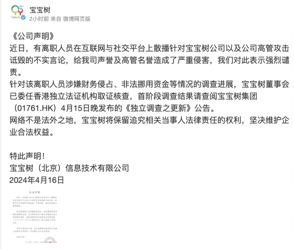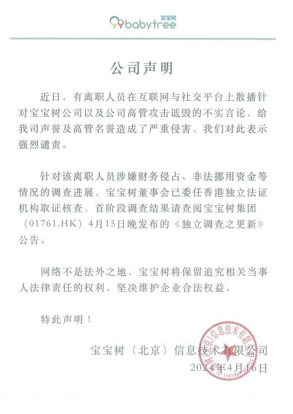 腾讯科技讯 4月16日,宝宝树在官方微博公告称,近期有离职职员网上散播针对宝宝树及高管攻击诋毁的不实言论,表现猛烈非难。 宝宝树称,该离职职员涉嫌财政陵犯、非法调用资金,公司已委托第三方取证核查。 前情提要 此前,网上流传对宝宝树的控告: 1、宝宝树“与一家名为尚乘环球市场有限公司(简称AMTD)的投资机构约定,令其以7,000万美金认购公司上市发行订单,并允许于上市发行当天,将全部7,000万召募基金以委托理财情势‘归还’AMTD”; 2、宝宝树“采取彼时‘中科创系’雷同结构单约3,000万美元”。 4月15日,宝宝树在港交所公告称,独立观察表现,根据可得信息,控告中所称一名本公司前董事为本公司“以个人乞贷名义‘出资填坑’”约人民币130,000,000元的说法仍无法证明。独立观察员已对本团表现有帐簿及记载举行广泛搜索,包罗从量身定制的法证技能步调中网络的电子数据库。于本公告日期,独立观察员并未发现任何声称的协议,亦未发现所谓的银行汇款证据以支持所称本团体亏欠该人士的乞贷存在的说法。 根据独立观察的开端发现,委员会以为彼等与本公司于2023年8月2日发布的公告中所载的本公司对控告的内部观察发现根本同等。别的,独立观察发现本团体与多少实体及/或个人间的多少财政生意业务及资金流,彼等表现多少本团体前员工大概存在非通例财政操纵、调用资金及/或占用资金。于本公告日期,独立观察仍在举行中。委员会将继承与独立观察员互助完成余下观察并尽快发布结论性发现正式陈诉。 以下为宝宝树微博公告: |