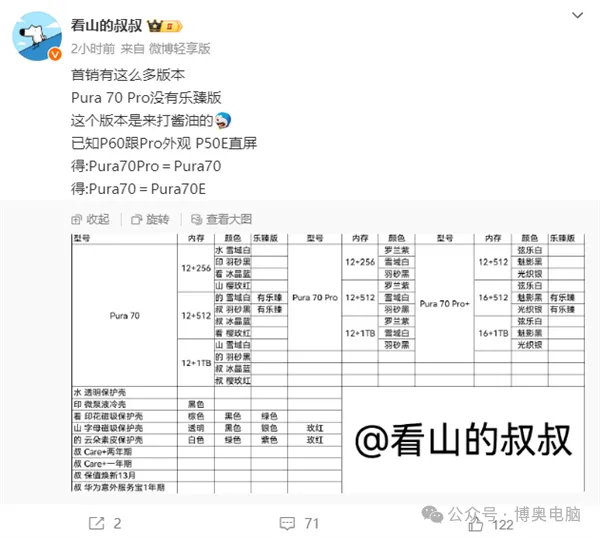4月16日消息,日前,华为公布P系列全面升级为Pura系列,新系列首款机型华为Pura 70即将登场。 本日,华为经销商“看山的叔叔”公布了华为Pura 70首销版本信息,包罗型号、存储规格、配色以及掩护壳等周边产物。 该博主体现华为Pura 70 Pro没有乐臻版,该版本机型是来打酱油的。 须要留意的是,博主还列出等式:Pura 70 Pro=Pura 70、Pura 70=Pura 70E,或在暗示华为Pura 70全系降杯。 从首销版本图来看,共有Pura 70、Pura 70Pro、Pura 70 Pro+,此前曝光的Pura 70 Ultra并未出现。 华为Pura 70全系12GB内存起步、256GB存储起,最高可选16GB+1TB的存储组合。 配件方面,华为Pura 70系列提供透明掩护壳、微泵液冷壳、印花磁吸掩护壳等多种掩护壳售卖。 据爆料,华为Pura 70全系接纳1.5K分辨率,中杯屏幕尺寸6.58英寸,大杯、超大杯都是6.8英寸,满足消耗者寻求小巧轻便、大屏畅爽差别需求。 值得一提的是,该系列迩来随时大概在华为商城上架,与Mate 60系列一样,到场先锋筹划。 目火线下店肆可担当盲订,代价预计和Mate60相近。 第三方机构对华为Pura70系列的销量非常看好。 天风国际证券分析师郭明錤之前猜测,对比2023年发布的P60系列,新系列的出货量将在2024年有显着的增长。 假如手机库存回补需求强劲,70系列出货量有望增长230%到1300-1500万台;假如需求放缓,也有望到达增长150%到1000-1200万台。 |
