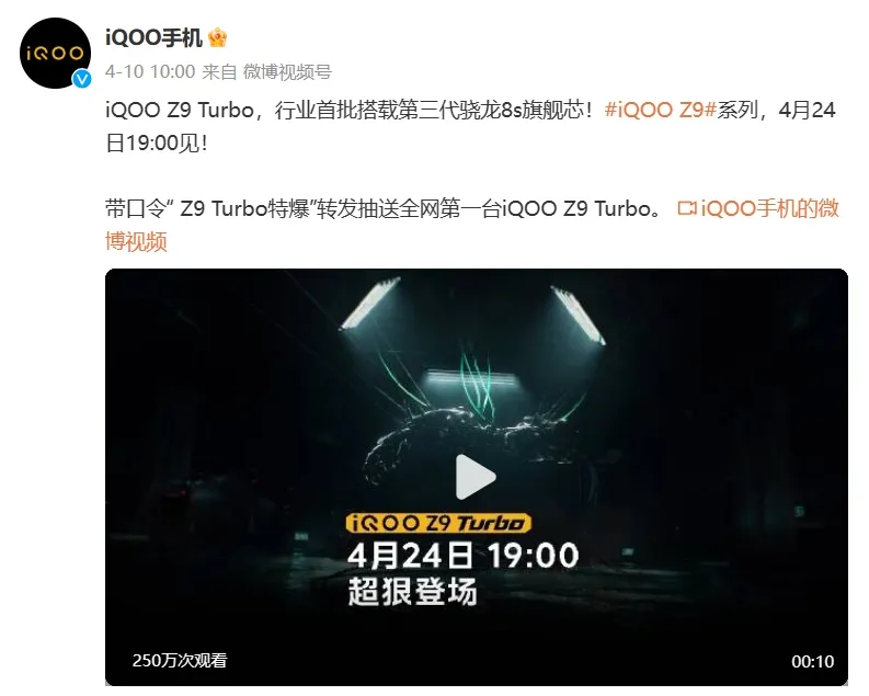 不久前,iQOO手机官方公布,iQOO Z9系列将于4月24日19:00正式发布。