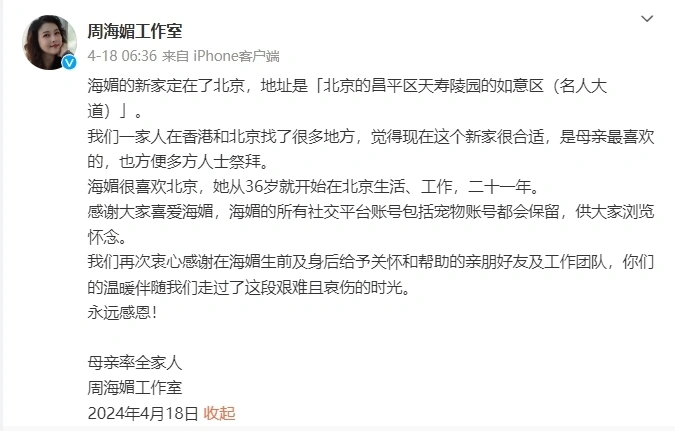 有句话叫作“有的人在世,但他已经死了,但有的人死了,却永久在世”。在不知不觉中,着名演员周海媚已经脱离我们将近4个多月时间了,即便厥后事不绝在一连操办中,但仍旧有许多网友和粉丝不肯信赖她已经去世的毕竟,提及此事难免感到含糊。 周海媚客岁12月由于突然心脏病,在家中去世,消息刚传出时直接引起了外界广泛讨论,固然有好友发声辟谣,但是仍旧没能改变毕竟。而后其母亲和姐姐赶往北京处置惩罚周海媚的后事,顺遂举行了告别仪式,并将周海媚生前豢养的宠物狗交给了可靠的朋侪照顾。 固然在此期间,周海媚的姐姐连续就周海媚的遗产、去世缘故因由做出了回应,但其骨灰会安葬在那边仍旧没有定论。直到4月初,周海媚工作室发声,明确表现颠末多方探求,终极决定将其安葬在北京昌平区天寿陵园的快意区(名士大道),既方便多方人士祭拜,更由于周海媚本身就非常喜欢北京。 要知道,周海媚是在香港出生的,但是由于喜欢北京,便从36岁就开始在北京生存、工作,不绝在这里住了二十一年。假如没有发生不测,周海媚应该会继续在北京安享暮年,过本身向往的退休生存,死后可以或许回到生前最喜欢的都会,想必她在地下也会感到安慰。 继工作室公布坟场选址后,周海媚坟场首度曝光,通过网友拍下的照片可以看到,周海媚的墓碑呈圆形,最表面一圈用影戏胶片的形状围绕,中心刻有她在《倚天屠龙记》中饰演周芷若时的画像,右下角刻有“周海媚”的名字,无论是墓碑的造型照旧镌刻的画像,都非常风雅。 周海媚一生饰演过无数脚色,但是周芷若一角深入民气,有“最美周芷若”之称。如今周海媚已经逝去,但是墓碑上的“周芷若画像”却宛在目前,一颦一笑温婉又逼真,全部统统都定格在周海媚最美的时间。不由得让人含糊,她真的已经永阔别开了我们吗? 而在周海媚的墓前,密密麻麻的花束尤为引人注目,都是粉丝自发送去吊唁的。通过观察可以发现,每束花上面都插着一个手写的卡片,上面是粉丝想要对周海媚说的话,也有粉丝将周海媚生前的明信片放在花束上,拜托哀思。看着无数的花束将墓碑围在中心,五彩缤纷引人泪奔。 值得注意的是,除了有大批粉丝切身前去墓园祭拜,也有许多网友隔空诉说着对周海媚的不舍,看得出各人对于她的死非常痛惜。 末了,逝者已逝,在世的人生存总要继续,周海媚是一位好演员,她会永久留在观众心中,只要有人还记得她,她就永久没有消散,盼望她在天国统统都好!#周海媚坟场曝光# |