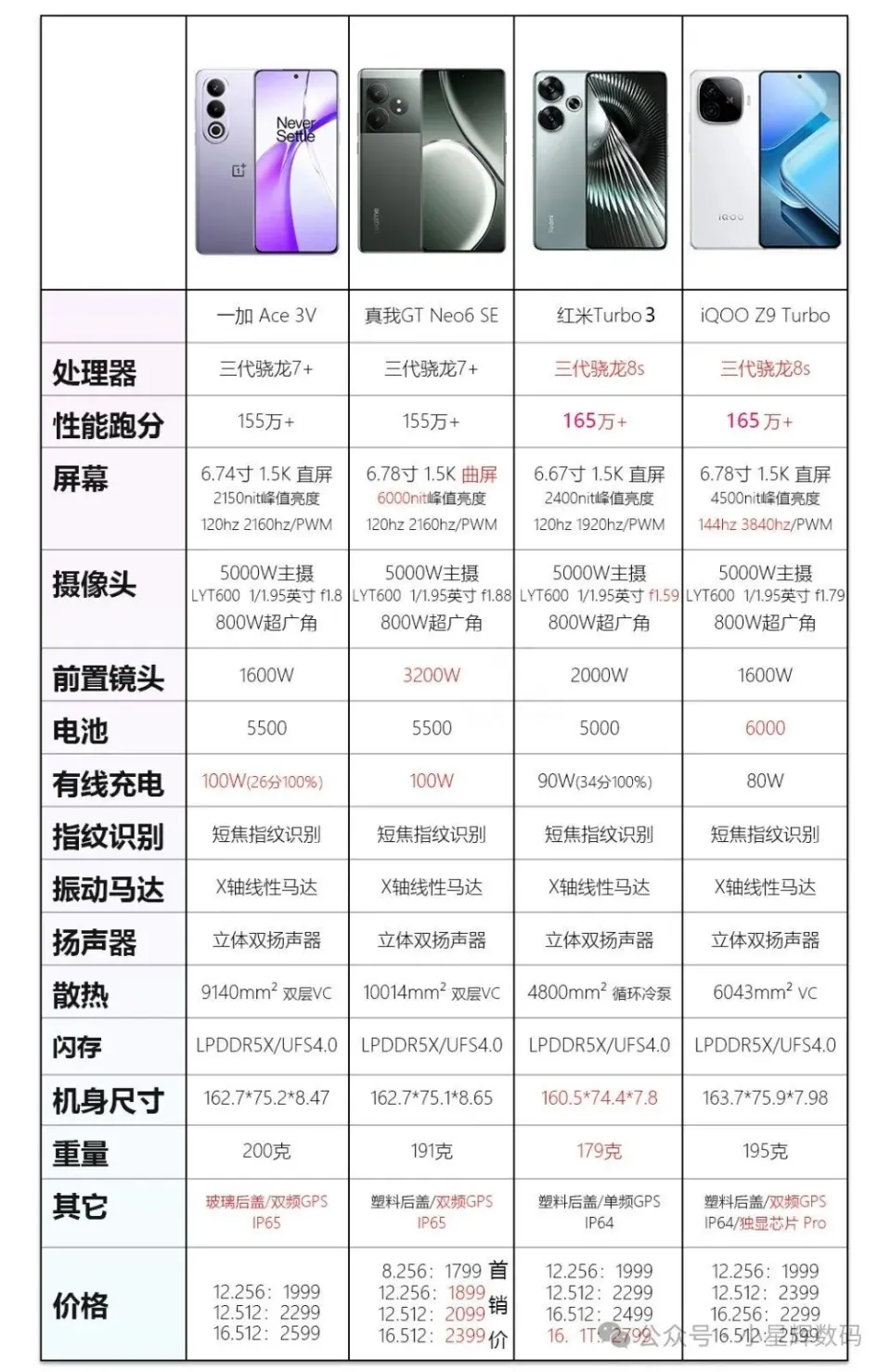 如今的手机行业竞争非常剧烈,各大品牌纷纷推出新品,试图通过良好的性能和公道的代价赢得消耗者的青睐。iQOO Z9 Turbo的上市,为中端机市场又注入了更多的活力,内卷进一步加剧。在这篇文章中,我们将通过对比一加Ace 3V、真我GT Neo6 SE、红米Turbo 3以及iQOO Z9 Turbo这几款手机的规格,来探究它们的性能优劣和性价比分析。 处置惩罚器方面,一加Ace 3V、真我GT Neo6 SE、红米Turbo以及iQOO Z9 Turbo都接纳了堪称旗舰级别的处置惩罚器,此中一加Ace 3V和真我GT Neo6 SE搭载了第三代骁龙7+,而红米Turbo和iQOO Z9 Turbo则配备了第三代骁龙8s。从处置惩罚器性能跑分来看,红米Turbo 3和iQOO Z9 Turbo依附骁龙8s的强大性能,在跑分上到达了165万+,略胜一筹。不外现实表现方面,骁龙7+,骁龙8s一样寻常流通度也不会有太大的差距。 屏幕方面,这几款手机在屏幕尺寸、峰值亮度和革新率上均有所差异,四款手机的分辨率都是1.5K水准,只不外真我GT Neo6 SE比力激进,不但接纳了直屏,还实现了行业稀有的6000nit峰值亮度,表现结果更加抢眼。iQOO Z9 Turbo的屏幕表现也比力激进,它的峰值亮度4500nit,且实现了3840Hz超高频PWM调光,支持144Hz高刷。至于一加Ace 3V 、红米Turbo 3,屏幕相对寻常一些。 相机方面,,这几款手机均接纳了5000万像素主摄,且都是索尼LYT600/IMX882水准,险些是探讨好的一样,超广角镜头也为800万像素。照相表现差距并不会很大。但在前置镜头设置上,真我GT Neo6 SE的3200万像素相较于其他几款手机的1600W或2000W像素具有肯定的上风。 电池续航方面,iQOO Z9 Turbo的6000mAh大容量电池无疑具有上风,不外充电功率80W表现相对一样寻常,一加Ace 3V和真我GT Neo6 SE则分别配备了5500mAh电池和100W充电功率,现实上更加平衡。至于红米Turbo 3,5000mAh大电池和90W快充的组合,表现相对垫底。 在代价方面,各款手机的定价与其设置和性能符合。以12GB+256GB定价都是1999元,不外真我GT Neo6 SE为了提升竞争力,首销给出了100元让利,12GB+256GB自制100元,1899元即可都是,别的8GB+256GB版本也比力亲民,才1799元。 末了总结 综合对比来看,以上四款手机在性能,屏幕,相机,电池等方面可谓各有上风,作为主打性价比的产物,他们的同质化还是很显着的,思量到定价根本同等。各人可以团结自己的预算和需求举行权衡买哪一款。 相对来说,如果寻求长期的续航,出色的性能,搭载第三代骁龙8s的iQOO Z9 Turbo是这个价位相称不错的选择。 对于寻常比力喜好浮滑的机身筹划,对性能要求也相对高一些,红米Turbo3也是这个代价不错的选择。 如果寻求优质的质感,喜好曲面屏,对屏幕要求相对搞一下,真我GT Neo6 SE则是这四款手机中,代价更加亲民的选择。 至于一加Ace 3V,核心的上风在于拥有更好的质感,ColorOS体系加持,售后方面也更有保障。 各人对以上四款手机怎么看呢? |