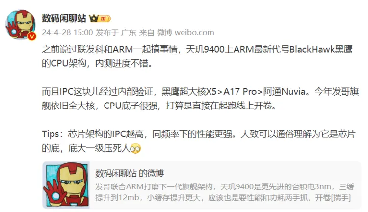 克日,着名数码博主数码闲聊站透露,联发科即将发布的天玑9400芯片将接纳Arm公司最新研发的CPU架构“BlackHawk黑鹰”。颠末内部验证,天玑9400的IPC表现优秀,此中黑鹰超大核Cortex-X5的性能逾越了A17Pro和Nuvia。对于资深的技能专家而言,芯片架构的IPC值直接决定了芯片在同频率下的运算效能,雷同于手机相机中传感器尺寸对照相质量的影响。因此,高IPC值被视为芯片性能的“基石”。由此可见,天玑9400的全大核CPU在性能上已经具备了明显的上风。 客岁的天玑9300开启了手机行业全大核的新赛道,不但CPU多核性能直接腾飞,能效表现也更上一层楼,产物力直接给竞品干懵了,一步坐上了本日的安卓旗舰芯皇。 在手机终端体验层面,全大核CPU架构已用气力证明方向对了,天玑9400被曝相沿全大核,且上了本年最强的BlackHawk黑鹰架构,可以说刚开局利市握双王牌。本年非常大概出现的局面是,竞品旗舰刚刚补完CPU全大核这一课,但在同频率下性能打不外天玑9400,假如硬要超频追赶性能,则功耗不保,因此这回合天玑9400的CPU根本是稳稳的了。 颠末几代的发展,天玑旗舰芯片在业界已树立了杰出的性能与能效标杆。无论是初次接纳的台积电4nm工艺,照旧全大核操持,都充实显现了联发科在CPU技能范畴的深厚气力与创新本事。固然如今时间尚早,但思量到天玑9400作为“年度旗舰”的身份,我们有来由等候其将来还将开释出更多强盛的技能潜能,为斲丧者带来更多优质的选择。 |