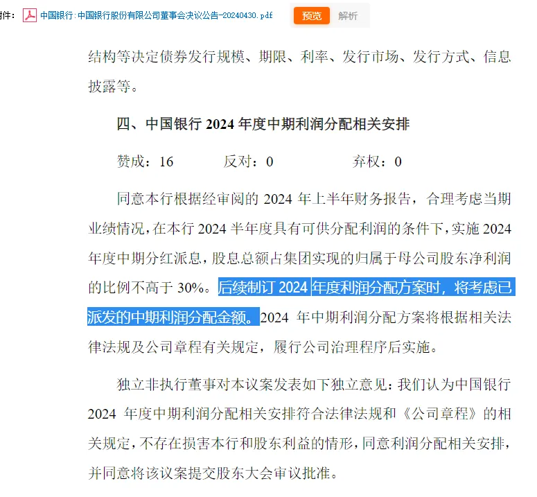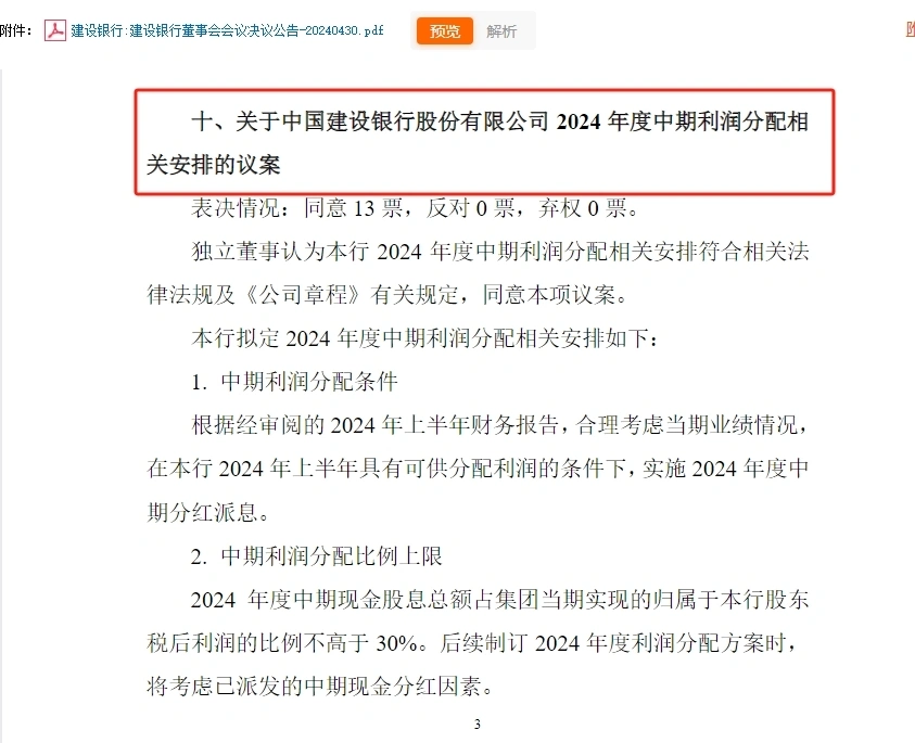 财联社4月29日讯(记者 邹俊涛)在多家城商行一连提及中期分红之后,国有大行今晚一锤定音。 4月29日晚,建立银行、农业银行、工商银行、中国银行同时发布董事会决定公告称,审议通过2024年度中期利润分配相干安排。 值得关注的是,四家国有大行均表现,2024年度中期现金股息总额占团体当期实现的归属于本行股东税后利润的比例不高于30%。 更为告急的是,四家大行均明白,后续订定2024年度利润分配方案时,将思量已派发的中期现金分红因素。工行还明白表现,“后续订定 2024 年度利润分配方案时,将扣除已派发的中期利润分配金额。” 财联社记者注意到,自4月12日资源市场新“国九条”出台之后,上海银行、苏州银行、兰州银行等多家上市银行的董事会已一连通过有关2024年中期分红方案。 但在四家大行表态之前,城商行层面相干议案并未明白中期分红与年度分红之间的关系。 4月29日,多位业内人士担当财联社记者采访表现,上市银行一连新增中期分红方案,意在相应此前新“国九条”对于加强分红的要求。 上述受访人士也坦言,比年来银行一连让利实体经济、净利差收窄等因素已挤压部分利润空间,银行继承增长分红存在寻衅。多位受访人士表现,进步分红频次并不意味着分红率和分红规模会有进步。 多家银行将举行中期分红,业内称为相应新“国九条”财联社记者注意到,现在已有多家银行订定中期分红方案。在四家国有大行之前,部分城商行已率先公布将举行中期分红。 4月26日晚,兰州银行第五届董事会第二十二次集会会议决定公告,拟于2024年半年度以当期归并报表中归属于母公司平凡股股东的净利润为限举行中期分红。同日晚,苏州银行第五届董事会第十五次集会会议决定公告,审议通过关于提请股东大会授权董事会决定2024年中期利润分配方案的议案。 更早前,4月25日晚,上海银行董事会六届三十三次集会会议决定公告,同意2024年中期利润分配事项。上海银行表现,分配条件需满意当期归并报表归属于母公司平凡股股东的净利润为正、各级资源富足率不低于羁系标准和公司资源管理规划目的、或预期实行现金分红后各级资源富足率不低于羁系标准和公司资源管理规划目的等要求。 上述多家银行在公告中称,订定2024年中期利润分配方案,意在为进一步明白投资者预期,加强投资者得到感。值得关注的是,上述相干议案仍需提交股东大会审议。 4月29日,某股份行研究员告诉财联社记者,近期多家上市银行提出中期分红方案,从情势上构成“一年多次分红”,积极落实“国九条”有关加强分红的政策步调。西南某券商的银行分析师向财联社记者表现,银行此举为相应新“国九条”。 是否会增长分红?业内人士:银行进步分红率空间有限不外,“在银行团体利润增速下滑配景下,银行进步分红的可行性存在肯定寻衅。”曾有在国有大型银行从业40年履历的经济学家、新金融专家余丰慧向财联社记者以为,银行比年来通过低落贷款利率、减免收费等方式支持实体经济发展,这在肯定水平上压缩了银行的利润空间。 财联社记者注意到,本年1月份,国家金融羁系总局公布,2023年贸易银行净利润2.38万亿元,同比增长3.24%。原银保监会在上一年度公布,2022年整年,贸易银行累计实现净利润2.3万亿元,同比增长5.4%。 余丰慧表现,此情况下,若要增长分红,银行必要在确保核心业务妥当发展、风险控制有用的根本上,探求新的红利增长点大概优化资本结构。别的,羁系机构对于银行的资源富足率有严酷要求,银行在决定分红计谋时,必须均衡好股东长处与羁系要求、长期发展之间的关系。 前述西南某券商银行分析师也告诉财联社记者,现在银行业分红率上限根本也就在30%附近,再往上提升的空间有限,而银行自身方面尚有资产增补压力。她指出,当前外源性的增补渠道受限情况下,银行核心资源只能通过内生性的利润留存来增补。 多位受访人士以为,分红频次增长并不等同于分红比例或分红规模的提升。前述西南某券商银行分析师指出,“只是频次变两次,总的分红率(可以)稳定”。某上市城商行相干人士也向财联社记者坦言,“感觉就是‘蛋糕’切一刀还是切两刀的标题”。 究竟上,财联社记者也注意到,四大行在今晚公布的有关2024年中期分红方案中均明白提出,2024年底利润分配方案将思量或扣除已派发的中期利润分配金额。 中期分红只是噱头?受访人士表现还是有积极影响余丰慧指出,假如分红比例保持稳定,多次分红的现实结果更多体如今现金流的分配频率上,而非总量的明显增长。他以为,这种做法轻易被解读为“噱头”大于现实收益。 前述西南某券商银行分析师表现,假如分红比例和分红规模没有变革,仅增长分红频次的话,对于投资者而言也仅意味着可以提前拿到一部分的分红而已。 不外,余丰慧也以为,上市银行增长分红频次,从市场和投资者角度来看无疑也是一个积极信号。一方面,更频仍的分红可以进步资金的利用服从,对于那些寻求稳固现金流回报的投资者来说,增长了投资的吸引力。另一方面,这种做法也能加强市场对银行红利本领和财务康健状态的信心,由于它意味着银行有充足的红利和现金流来支持多次分配。 别的,“一年多次分红机制也有助于银行更好地管理资源结构,适时调解,以应对市场变革。”余丰慧指出,长期而言,银行在思量调解分红