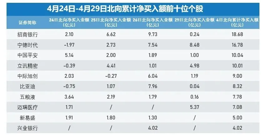 4月29日,A股三大指数放量大涨,克制收盘,沪指涨0.79%,收复3100点;深成指涨2.22%,创业板指涨3.50%。全市场超4500只个股上涨。 北向资金继上周五录得陆港通开通以来最高单日净流入(224.49亿元)后,本日再度大幅净买入A股108.92亿元,连续4日加仓累计超380亿元。 据Wind数据统计表现,4月24日至4月29日期间,北向资金累计净买入额前十位个股中权重股较多。招商银行、宁德期间、中国安全累计获北向净买入额位居前四位,均获净买入超10亿元。 招商证券体现,近期外洋投资机构纷纷看多中国资产。托管于外资机构的北向资金是2月6日以来和上周北向资金净流入的主力,对金融、食品饮料、电力装备、有色金属等行业的偏好依然连续。思量到美、日、印等重要市场的估值都处于高位而中国资产当下是估值洼地,预计更多外资将回流中国,动员A股重回上行趋势。 光大证券指出,从汗青环境来看北向资金大幅流入期间,领涨概率较大的行业有有色金属、食品饮料以及TMT板块,这大概与北向资金持仓占行业流畅市值的比重较大有关。团结北向资金近期的流入偏好,发起关注北向资金对于消耗、电力装备以及银行行业的影响。 |