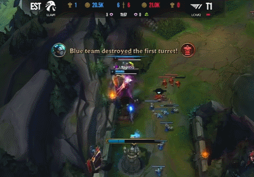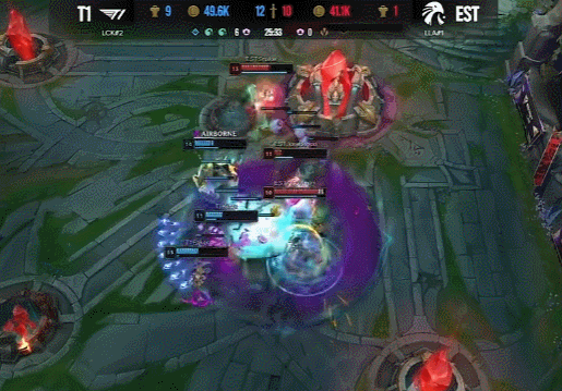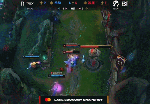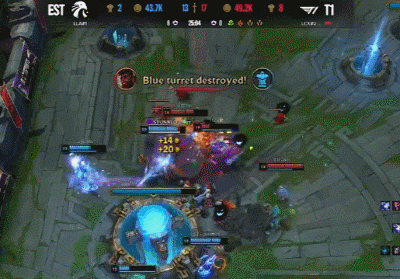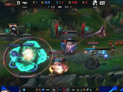 不绝到20分钟,双方经济都没有拉开太大差距。但是EST一波着急想秒Faker,被Faker金身化解,Oner破败王进场收割,斩获四杀,将EST打崩。
