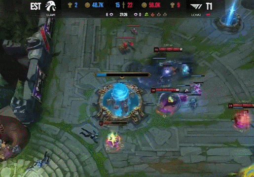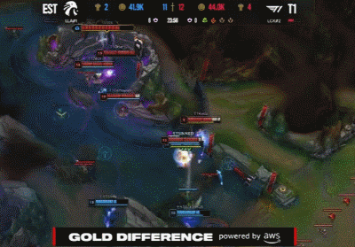 但是双方的运营气力差距还是很大,EST总是抱团抓人,T1则不慌不忙,冷静发育控资源,保持经济不绝领先。T1拿下大龙之后,不到30分钟拿下首局。
