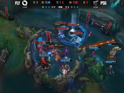 MSI的揭幕战,FLY vs PSG的第一局比赛,双方就鏖战了凌驾40分钟。PSG通过后期双C沙皇+赛娜的发力,先下一城。