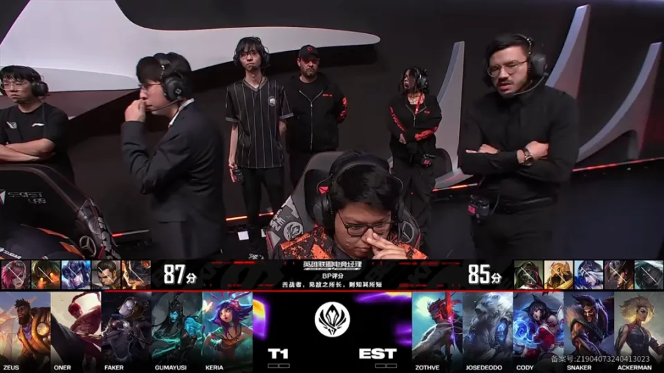 次局由LCK亚军T1对阵拉丁美洲赛区冠军EST,99.9%的人都会信赖T1会赢。BP阶段T1没有因对手是外卡就科研整花活儿,选的都是相称妥当的英雄。反倒是EST更加大胆,在Zeus面前玩永恩,在Faker面前玩狐狸,下路德莱文硬刚Gumayusi卡莉丝塔。
