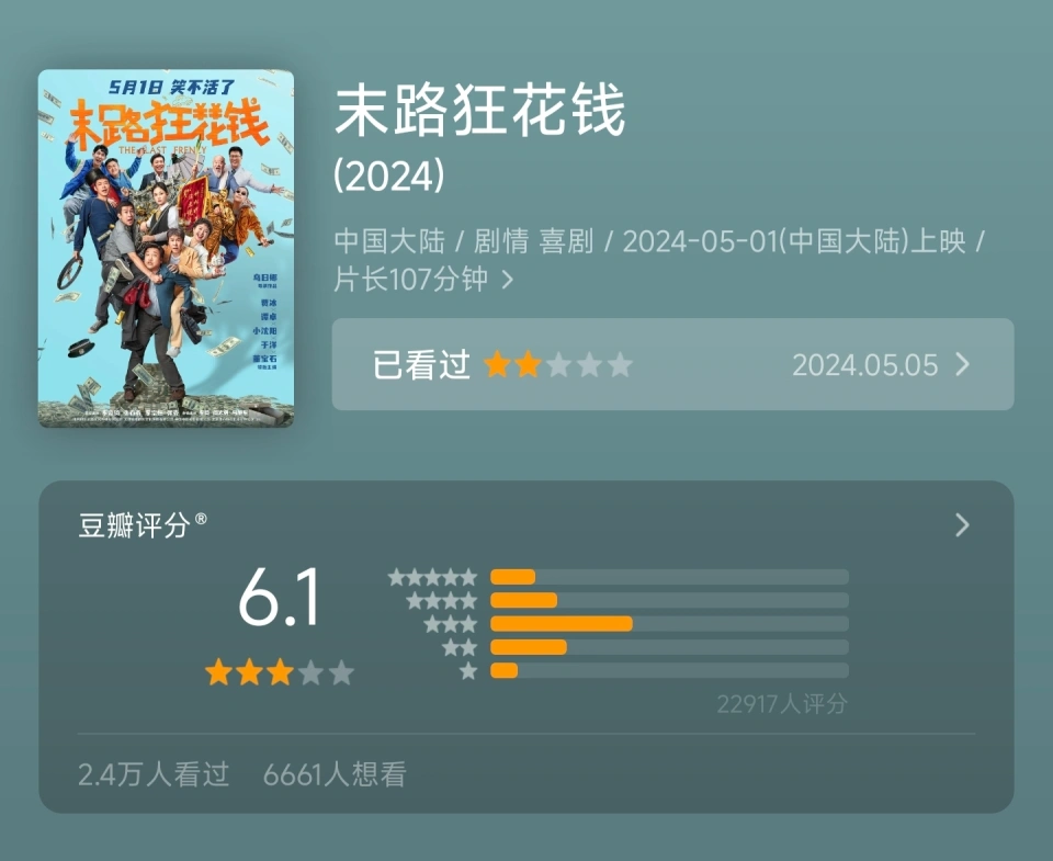 五一档到如今,结果出乎全部人料想。 先是港片《九龙城寨之围城》点映爆火。 本以为是港片老三样,没想到漫画改编回归,观感爆棚,票房节节攀升竟打响了五一档第一枪。 接着档期正式开始,《维和防暴队》率先出位。 口碑是最烂的,票房却是最好的。 王一博的粉丝用真金白银证明白粉丝经济依然坚挺。 可其他电影却遭了殃,此中以《没有一顿火锅办理不了的事》最惨。 名导出品,主演有流量杨幂,有实力派余皑磊,有天生路人缘的于谦、李九霄、田雨。 本以为是盘大菜,可结果却馊了锅。 上映不久口碑与票房就双双遇冷,导演丁晟直播无语凝噎,本日竟然暂时撤档,提前认输。 而最令人意想不到的是《末路狂费钱》。 导演是新人,主演仍然是东北笑剧人那一帮,贾冰、小沈阳、于洋和董宝石。 怎么看都是一副网络大电影的扑街像,可上映后却愈战愈勇,从3号开始就稳居日票房榜第一名。 5天累计3.7亿票房,成为五一档最大的黑马。 确实,票房赢了。 可质量却一言难尽。 口碑只有6.1分刚刚合格,仅比《维和防暴队》好了一点点,看完之后我必须说一句: 要不是五一档没有其他笑剧片,它能有这个票房? 中年男子的团体意淫光是名字就让我感到不适。 本片片名和此前的《这个杀手不太岑寂》、《李茂换太子》如出一辙,都是在某些家喻户晓的词条上加字大概玩谐音梗。 原版是来自1991年,由雷德利斯科特导演的经典电影《末路狂花》,陈诉的是两位女性在男权社会中被压迫与欺辱中一起遁迹,是标准的女性主义作品。 可本片讲的是什么? 一群中年男子的消费狂欢,在原版电影根本上就已经构成了侮慢。 而脚本的出现更杂乱,更不可理喻。 《末路狂费钱》,说的就是在“末路”上“狂费钱”。 贾冰扮演的“贾有为”人到中年一事无成,最大的理想是凑够一百万躺平人生,但薪水太少只能节省,日子过得精打细算。 洗脸用滴水不耗水表,牙膏用擀面杖挤,上超市全买临期还用优惠券抵扣。 可忽然有一天贾有为被检查出了脑瘤,只有差不多十天的寿命。 怕应了小沈阳的那句话“人死了,钱没花了”,抠抠索索一辈子的他决定要浪费人生,而后卖掉了房子凑够一百万,叫上了童年的三个发小踏上了费钱之旅。 铁公鸡10天内要花光100万,这是个标准的范例片设计。 我估计很多人看完预报片后都是奔着《西虹市首富》的等候买票的,看看贾冰、小沈阳他们该怎样演绎穷人乍富,也能让本身干涸的财务状态割肉医疮。 然而,电影的费钱桥段却很少,而且极其“没有创意”。 无非照旧那几种,租个豪车、住个总统套房、大概在阛阓疯狂扫货.... 这些桥段连观众都能想象出来,真烦闷一群号称是“中国笑剧将来”的东北演员们,怎么在这种标准考题的表现云云乏味。 唯一的故意思的桥段也就是到饭店狂点海鲜,然后把它们放生算是希奇点。 还没反应过来,电影就忽然来到了第二幕,贾有为开始寻求童年女神“王晓倩”(谭卓饰)。 到这一趴,电影的团体基调忽然变了。 贾有为又开始束手束脚,我明确这是遇见女神时正常的生理反应,但作为一个身价百万的将死之人,尤其是不在乎钱的环境下,岂非不应该做出更多凡人不能明确的搞笑办法吗? 可贾有为也执偾买了个坟场、趁便买了几个裙子送给她而已。 就连借主找到王晓倩时,贾有为明显有钱可照旧被吓跑,末了更是不拿钱和别人火拼。 不是? 咱到底是“狂费钱”照旧“不费钱”? 人物的逻辑没有惯性啊。 结果追着追着女神,医院忽然来了电话,说误诊了,真相明确了。 我一看表,这才一个小时就把答案公布了,脚本的支持点没有了,背面另有40分钟的时间演什么呢? 编剧大笔一挥,2个字: 意淫。 发现本身没病后,贾有为忽然又变回了铁公鸡,哭着闹着想保住末了的钱,还和哥们恶语相向,同室操戈。 几天的相处没有给他带来任何变化,人物弧线为零。 可房子被卖了,钱也没了,只能露宿陌头在坟场睡觉。 此时,《末路狂费钱》的片名就已经失效了,取而代之的是另一个全新的脚本。 电影忽然转向了兄弟情,贾有为在本身坟场看到兄弟们的纸条感动到鼻涕横流,而后忽然改过自新,要帮三个朋侪完成愿望。 而前半段对三位朋侪的脚色铺垫就开始渲染了。 说沙白虎(小沈阳饰)老婆是乐成的带货主播,而他没有个人古迹也帮不上老婆的忙,在家像是透明一样没有存在感。 董剑锋(董宝石饰)单亲爸爸,一个人抚养儿子,工资少和儿子的关系也不融洽。 许鼎力大举(于洋饰)更惨,小时间崇尚武术,幻想着打遍天下无对手,长大后却只能做保安。 简直,这很“惨”,这很“中年”。 可题目是,这三个脚色却不能引起观众共情,因为他们困苦的缘由并没有被显现出来。 沙白虎家庭职位低,没有存在感。 可编剧写他怎样努力,怎样想要资助老婆,大概做出某种着实的结果,但仍然没有得到老婆认可吗? 没有,他只是默默担当老婆带来的红利,毫不勉强做一个家庭煮夫。 许鼎力大举想要参加拳击比赛,想要一鸣惊人。 有生存目标值得尊敬,然而他追梦的方式却是在工作时间擅去职守。 董剑锋和老婆仳离了,带着儿子生存,而他除了买平板之外,也不能给孩子提供什么,也就只有努力学rap还算是表现出了零星父爱。 一个软饭硬吃,一个擅去职守,一个口头上的好爸爸。 三个中年男子看似被生存压迫,实则都是他们咎由自取。 编剧懒得在脚色上费笔墨大概说删掉了某些