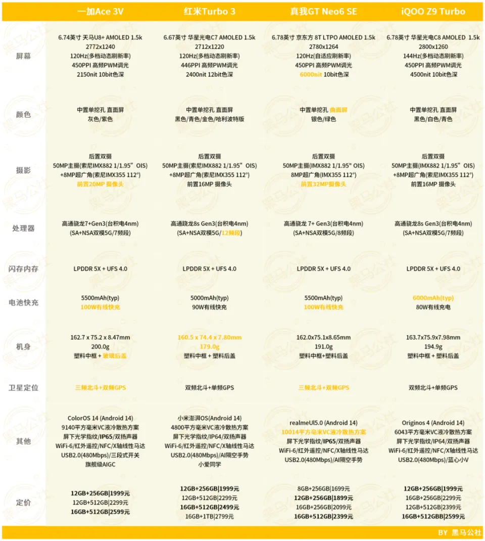 全体眼光看向我!前几天,iQOO Z9系列正式发布了! 为什么专门拎出来说呢? 由于黑马我啊,等它等了快一个月了! 信赖不少朋侪和黑马一样在等它,不为别的,重要就想看看—— iQOO Z9 Turbo上市之后,迩来发布的这一水儿1999元起售的中端性能旗舰机中,到底谁才是真正的射门员? 等一下,你也是Turbo? 开个打趣…… 为了更直观的感受区别,黑马把一加Ace 3V、红米Turbo3、 真我GT Neo6 SE、iQOO Z9 Turbo的参数拉了个表,有爱好的可以点开大图看看。 一加 Ace 3V/红米 Turbo 3/真我GT Neo6 SE/ iQOO Z9 Turbo具体配置规格对比 小观察: 很抱歉,请在手机微信登录投票 哪一款戳中你心巴了? 单选 一加 Ace 3V 红米Turbo3 真我GT Neo6 SE iQOO Z9 Turbo 都不太行,批评区见 四位参赛选手表现算是各有所长,话不多说,先来看看横评。 1999元射门员,各有所长 照旧先看表面吧,这个机身标题各人吐槽了挺久,重要就是除了一加 Ace 3V有玻璃后盖,剩下3个则均为塑料中框+塑料后盖,毕竟,在这个价位区间,想配上玻璃后盖照旧不多的; 以是假如你不能担当塑料背板,那么,在这4台机子里,一加 Ace 3V就是唯一的选择了。 (PS:黑马测了一下红米Turbo3塑料机身的防摔本领,除了直担当力点有点变形之外,其他地方毫发无损;其他几款机子,有履历的可以批评区聊聊防摔不?) 屏幕方面,四位都是OLED屏幕、1.5K分辨率,此中iQOO Z9 Turbo这次用上了小米14同款的华星光电C8、144Hz高刷,峰值亮度有4500nit;真我GT Neo6 SE的京东方无双屏,峰值亮度有6000nit,并且照旧首发搭载,也是唯一搭载曲面屏的机子。 屏幕素质上,iQOO Z9 Turbo和真我GT Neo6 SE会更良好一些。 处理处罚器方面,四台机子重要搭载的是7+ Gen3和8s Gen3两款处理处罚器,关于这两个芯片的区别,黑马在之前的文章里也有具体表明。(详情戳:1999元?小米新机,照旧太贵!) 简单来说就是,这俩都是8 Gen3同款架构,但实际能效表现都要比客岁的8 Gen2差点,具体对比的话,主频的提拔照旧让8s Gen3比7+ Gen3更强上一点。不外实际体验应该不会有太大区别。 图源:网络 续航方面,原来黑马以为5500mAh的一加 Ace 3V和真我GT Neo6 SE就挺好的了,但当黑马看到了iQOO Z9 Turbo的6000mAh超大容量电池……(Turbo3你看看你!) 但是假如把眼光转移到快充,一加 Ace 3V和真我GT Neo6 SE的100W快充就显得更有吸引力,反而是6000mAh的iQOO Z9 Turbo只配备了80W快充。 一加 Ace 3V号称26分钟满电,而90W快充的红米Turbo3,34分钟能充满5000mAh电池,各人可以参考一下。 尺寸方面,红米Turbo3以6.67英寸屏幕和160.5 x74.4x7.80m的机身尺寸,成为四台机子里最小巧的一台。 别的,红米Turbo3的电池容量也没白阉割,179g的重量吊打其他三台机子,握持感也非常Nice,是黑马比力喜好的那种轻盈机子。 别的就是散热标题,塑料后盖大概率会加大散热压力,但真我GT Neo6 SE搭载了10014平方毫米的VC均热板,乃至超越了一些专业电竞手机,从参数而言,散热应该会处理处罚的比力好。 不外就黑马手上的红米Turbo3来看,塑料后盖固然会导致散热压力大,但是在均热板处理处罚下,跑分和长时间游戏中并不会出现“烫手”的感觉,只管团体机身温度会上升,但比金属材质强导热带来的体验,照旧要好很多。 至于影像方面就不说了吧,性能呆板懂得都懂;假如有强需求照相的,在千元机价位区间,不如去看看真我12Pro+,1699元还带6400万潜望长焦,你品,你细品! 别的,一加 Ace 3V和真我GT Neo6 SE搭载的是三频北斗+双频GPS,在利用体验上,应该会比双频北斗+单频GPS的红米Turbo3和iQOO Z9 Turbo好一些。 总结一下,一加 Ace 3V的重要上风在于较大电池和 100W 快充,后盖材质为玻璃,质感更好,而且三频北斗+双频 GPS 非常实用,VC液冷散热覆盖面积上风显着,尚有着 IP65 级防尘防水。 真我GT Neo6 SE和一加 Ace 3V差不多,但屏幕素质非常良好,拥有6000nit的峰值亮度;别的VC液冷散热覆盖面积也是最大的。硬要挑缺点的话,黑马的梦中情机还得是直屏。 红米Turbo 3的重要上风在于高达 12 个的 5G 网络频段,其他三款则只是 7/8 频,别的相对较小的屏幕和更轻的重量,也能打一波差别化。 iQOO Z9 Turbo的屏幕素质也相对不错,144Hz 革新率,峰值亮度高达 4500nit,但黑马以为最大的亮点应该是6000mAh 的超大电池,估计能戳中了一部门用户的痛点。 没预料中那么香 但是啊,这波中端性能旗舰,黑马等的时候挺等待的,盘的时候就以为好像好像差点意思。 好比这个处理处罚器,只看对比各人都半斤八两,但是假如拿来和上代的8 Gen2比力的话。 Emmmmm…… 黑马去搜了一下客岁那批8 Gen2的次旗舰,现在也就比这批新机贵了几百块钱。 固然这批新机,各方面看上去哪哪都还不错,但是相比水桶机又确实阉割了不少内容,塑料机身还劝退不少人。 大概iQOO Z9 Turbo这种,在某一方面特别强的,依旧还会有点市场,但假如没有特别需求,上一代次旗舰真的可以说直接秒杀它。 再加上黑马之前在红米Turbo3里写道,上一代中端机(红米 12 Turbo、一加 Ace 2V 尚有真我 GT Neo5 SE )现在代价也降下来了,要便宜一点我们可以“隔代香”,但追求性能的用户,又有上一代次旗舰可以选择。 一加Ace 2V部门配置 不得不说,这批新的1999射门员们,真的挺尴尬的。 实在黑马发现,客岁中端性能机开始卷性能、卷代价、卷快充,有一部门因素是各厂商配件库存不少,好比客岁特别火的大内存就是旗舰机下放到中端机的。 再加上客岁手机市场团体出货量都在下滑,上游芯片、面板的供应代价也在下滑。