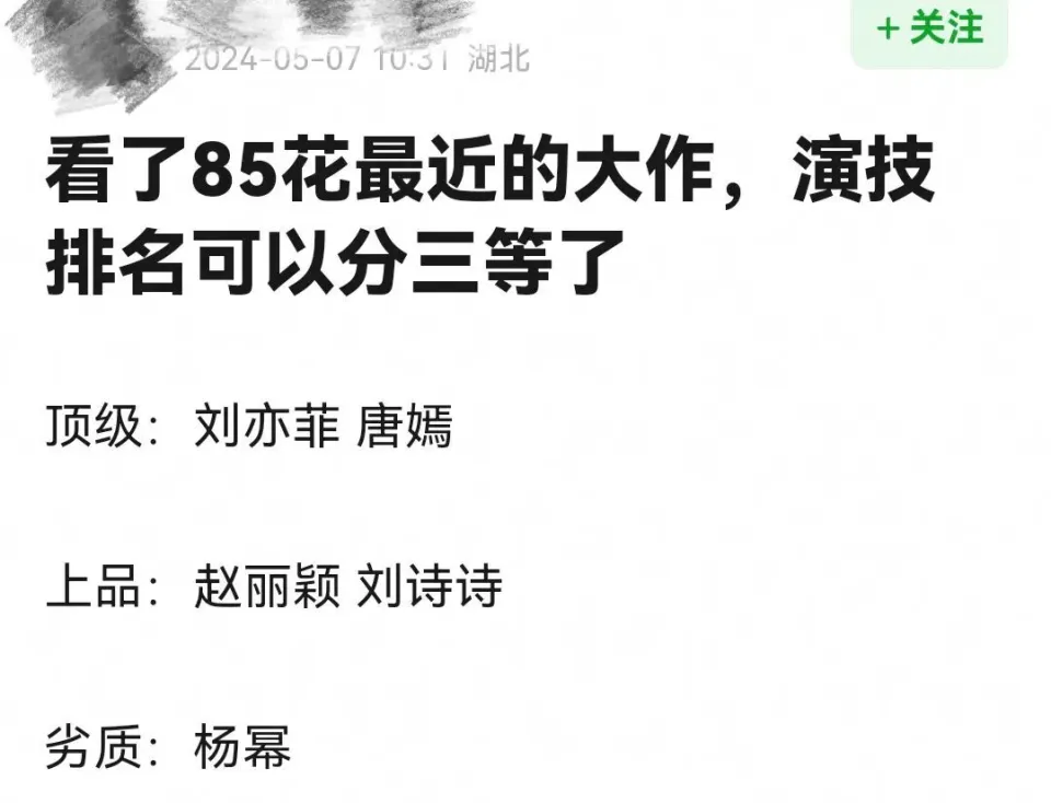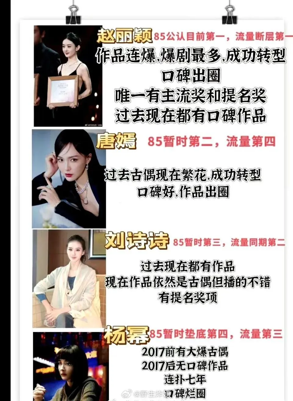 本日大事报:自筹拍起就闹得满城风雨的世纪大饼《酱园弄》,官方脚色简介千呼万唤始出锅了! 杨幂和赵丽颖两边粉丝一来一回battle了n个回合的女二号——“苏青”一角到底属于谁也终于尘埃落定。 固然公布的脚色中没有叫苏青的,但是先前跟进过打斗瓜的网友估计都知道,苏青的人物设定是一位女作家,主线剧情是为女主詹周氏翻案。 简介来看,赵丽颖扮演的西林(作家、剧作家、交际名媛。当她的戏剧忽然被毙掉时,偶尔发现了一个匿伏的更换脚本:一部基于所谓的“丈夫杀手”詹周案件的作品。西林敏捷捉住围绕审判的宣传提供的时机,以救济本身陷入困境的职业生存)根本符合。 但杨幂扮演的王旭梅(詹周氏的同牢房囚犯,被尊为监狱的“大姐”。曾经是广受欢迎的上海女主人,但当她陷入窝藏逃犯案时,生存发生了巨大变化,但她仍旧对出狱布满信心)就差得有点十万八千里了。 关于苏青,最早是杨幂在客岁5月被传出要演《酱园弄》,被大粉实时辟谣了。 然后是9月赵丽颖被拍到和陈可辛会餐,词条下各人纷纷猜测起是不是即将合作。 杨幂粉丝喊冤“简直是无妄之灾”,赵丽颖粉丝自得“影戏新人又弯道超车咯”,两家第一次因这个饼开打,新仇旧恨一起算,打得不可开交! 到了11月尾,又有较为靠谱的媒体消息说杨幂已确认出演《酱园弄》。 紧接着12月尾杨幂本人出席GQ运动时,在内场亲口跟辛爽导演说“我准备进《酱园弄》”。 豆瓣也把杨幂名字加到了《酱园弄》演职员表内。 #总之就是一切的一切都出现出一种板上钉钉没跑了的趋势!# 固然当时也有出来说杨幂并非女二、只是客串的网友,但这个说法大粉也很快出来打假了。 杨幂粉丝:出演为真,客串为假,那不就是变相认可了演的是女二嘛! 于是各人如饥似渴就开始敲锣打鼓提前庆祝,高兴之余也没忘踩一脚赵丽颖,明里暗里的看不上:有些人也要看本身有没有本领和杨幂抢。 效果没多久,新爆料又来了,说赵丽颖才是真正的女二作家,杨幂只是客串女囚。 #进展到这里已经跟本日的官宣都对上了,不外介于后续还传出过女二人选变成了江疏影,说法多了,连带着全部爆料的可信度都骤减,粉圈战役是真·始终没见平息# 讽刺的是,杨幂粉丝原来就在和赵丽颖粉丝的“苏青夺取战”中落了下风,刚好杨幂中午还有本新鲜出炉的杂志,她在采访中提到本身视本年为“再出发的一年”、“不摆烂的一年”,表现“终于演到了想演的脚色”,让外界“等着瞧吧”。这下好了,又被嘲“提前开香槟”了。 网友:杨幂又开始给本身提供倒油素材了...... 其实两边粉丝争的也不是苏青这个脚色,只是在女主百分百是章子怡的条件下,两边都想要女二。 《酱园弄》改编自蒋峰的小说《翻案》,苏青在内里是和詹周氏不分上下的告急脚色,一开始乃至有人不确定章子怡演的是苏青还是詹周氏,论脚色的传奇性和可发掘度,女主毋庸置疑是詹周氏,但要按戏份来分别,苏青会比詹周氏更像女主。 但这是原著里的设定,影戏改编成什么样,在上映之前,谁也不知道。现在《酱园弄》官方并没有定过明确的番位,官宣全阵容时不停都只按脚色出场次序分列。 再说了,脚色简介上,全部副角看上去演技发挥都还挺有空间的啊,每一个形象单拎出来都富足丰富饱满。 有秘密的瞽者算命师,真实身份和年事成谜、有为日本傀儡政权工作的副警察局长,坚信本身行为公理,又从未停止过以为本身大概是叛徒、还有平静而胆小的锁匠,却和案件难逃干系...... 西林这种不被期间局限的独立女性脚色魅力大,王旭梅那种南北极反转从上海女主人到监狱大姐头的脚色也不见得就差吧?只要演好了都能吸粉,各凭本领就是了,粉丝为什么只执着于哪个人的番位在前呢? 戏里番位是要比的,戏外实绩也是不能少的。和《酱园弄》脚色简介一起出现的是,官方对参演演员们个人履历的先容。网上就有许多针对两人谁的先容更有含金量的评选。 先容赵丽颖时,告急夸大了奖项,说她是一个得到不少奖项的气力派演员;而先容杨幂时,重点夸大了资历,说她是一个活泼30年,出演几十部电视剧、几十部影戏的演员。(角度都不一样,到底有什么比如的?也是奇了怪了 但无论是番位还是实绩,最少是实打实发生的事变,委曲明白一下也没那么想不通,离谱的还在背面呢!有网传消息称《酱园弄》5月24号会在戛纳首映,主创都会去,于是#赵丽颖杨幂 戛纳# 就嗖嗖的登上了热搜,词条下粉丝们又水火不相容似的相互拉踩。 不是,怎么全主动替两人红毯同台竞技起来了?且不说这运动杨幂和赵丽颖参不到场还没个准信,她们同台也不肯定就必须比个胜负啊,这个天下是不答应有喜欢百花齐放的观众存在是吧? 在戛纳这种国际影人大场面露脸宣传华语影戏是功德,南风划一等待每位中国影人都能发挥超常,love&peace。 《酱园弄》杨幂和赵丽颖两个人都参演了,票房好不好是共同的,票房好了俩都开心,扑了俩都会被嘲演技差拖戏骨们后腿。好好宣传夺取共赢不比相互内在打斗起哄告急啊? 有句话说得好,天下纷纷扰扰,85花缱绻到老。这边杨幂和赵丽颖还没比够,那里没参演《酱园弄》的85花也被拉出来重新洗牌了。 有网友看了85花迩来的作品,表现她们如今的演技排名可以分三等。刘亦菲、唐嫣是顶级,赵丽颖、刘诗诗是上品,而杨幂是劣质。 还有网友做了张“85花现排位”的图,给赵丽颖、唐