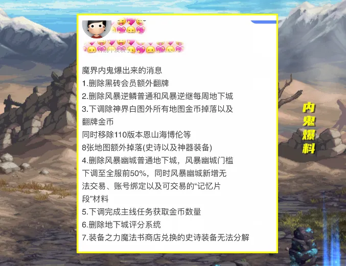 搬砖是各人比力关心的事变,而今游戏内的金币,又开始破90比例了。有玩家晒出“魔界”体验服,“内鬼”爆料的相干改动,涉及诸多方面。 “内鬼”爆料7大游戏搬砖方面改动为了遏制游戏内的“经济紊乱”,“内鬼”爆料出接下来版本,筹谋会从7个方面上入手,来进行调整改动。 【1】删除“黑钻”额外翻牌。实在现阶段神界舆图,黑钻已经没有额外翻牌嘉奖了,但一些低级图仍旧存在。好比“沉寂城”时空缝隙,全依赖黑钻翻牌,额外的增长收益,成为部门玩家搬砖首选舆图! 【2】“每周”和“寻常”风暴逆鳞副本删除。“内鬼”透露,将来风暴逆鳞寻常和每周地下城,将会被筹谋给删除,有些出乎意料啊。 【3】“内鬼”表现将来,会下调除了神界白图外,全部的舆图金币掉落,以及翻牌金币,同时移除110级版本“恩山”和“海伯伦”等副本,这个改动对搬砖玩家来说,并不是一件功德,意味着收益大减! 要知道,许多搬砖不了“风暴幽城”的玩家,会选择“恩山”或“海伯伦”。且“工作室”的号,都扎堆搬砖“海伯伦”副本,这下删除了,金币收益会受到影响。 【4】“内鬼”透露“风暴幽城”寻常模式会删除,同时冒险门槛下调至全服前50%,且新增无法生意业务、账号绑定和可生意业务的“影象片断”质料。 “风暴幽城”寻常模式删除,小号搬砖何去何从?而冒险全服门槛下调至50%,会让一些原本名誉无法达标的,也可以或许进去搬砖了! “影象片断”这个质料,是“雾神”攻坚战版本,推出的新深渊副本,入场须要的门票。 【5】针对主线使命获取的金币数量,“内鬼”爆料表现会下调,来谨防出现“薅羊毛”的状况。 【6】地下城评分系统,“内鬼”透露将来会删除,这就比力惬意了!各人都知道,DNF这款游戏内,存在着“评分系统”,影响着金币收益。角色伤害比力高,当搬砖的时间,很难打出“3S”评分,收益就会淘汰。 以是对于“评分系统”,搬砖的玩家都“深恶痛绝”,等候有一天筹谋可以或许删除,这一次“内鬼”总算带来了好消息。 【7】现阶段赛丽亚房间内,“装备之力邪术书”市肆,兑换的史诗装备可分解。据“内鬼”表现,经过改版后,就无法进行分解了。 由此可见,“内鬼”爆料的内容改动,足足包罗了7大方面,一旦实装的话,对游戏的金币影响,也是非常大的。 个人总结怎么说呢,这一次针对游戏内“经济系统”方面上的改动,只是“内鬼”爆料的,筹谋并没有发布公告阐明。DNF游戏中的“内鬼”,也是比力多的,偶然间有些内容,爆料的精确性高些,但有些内容不太精确。以是此次“内鬼”爆料的相干改动,各人不必太认真了,当个参考就行了! |