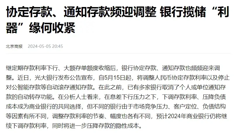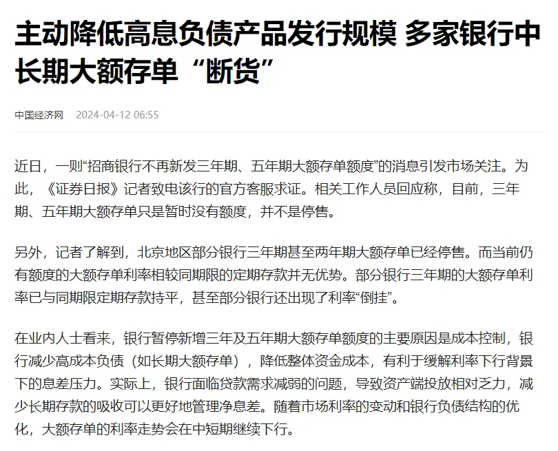 原创 刘晓博 为了拉存款,各大银行发明白出许多“高息产物”,除了常见的大额存单,尚有协定存款、关照存款、智能存款等。 最近,各大银行突然“集体反悔”,开始限定、叫停这些昔日的“拉存款利器”。 好比多家银行的中长期大额存单断货: 大额存单是由银行向个人或机构发行的一种大额存款凭据,通常环境下个人20万元起投,限期从1个月至5年不等。 由于大额存单可以一次性汲取、锁定大笔存款,所以银行愿意付出的利率比力高,受到储户欢迎,也因此成为银行间竞争的利器。 协定存款、关照存款也在收紧。 所谓协定存款,就是资金量比力大的单位或个人跟银行会商,告竣存款协议,以享受较高存款利钱和相对灵活的支取方式。 至于关照存款、智能存款也都大同小异,无非是你存入更多资金,银行给你更高利钱,你提前支取的时间只管不按活期付出。 总之,银行集体“反悔”了,纷纷动手整理之前中长期的、利率较高的各类存款,要么停息贩卖,要么低落利率。 为什么会出现这一征象,它意味着什么? 短期看,这是为了压降存款成本、保证息差,为新一轮降息做预备。 长期看,则是为未来漫长的低利率,甚至超低利率期间做预备。 先看短期。 众所周知,疫情和百年未有之大变局改变了预期,住民对加杠杆(负债)非常慎重,越来越热衷于存钱。到本年3月末,天下银行体系里的住户(住民)存款到达了146.4万亿元。 假如从2023年1月算起,5个季度里增长了20万亿。 别的,银行理财产物的余额也到达了28万亿左右。 这170多万亿“老百姓手里的钱”在银行里躺平,拒绝消耗、投资,成为经济复苏最大的停滞之一。 并由此引发了通缩,最近12个月,CPI同比涨幅一直在零附近上下波动,最新为0.1%,间隔理想的通胀目标2.5%差距明显。 还带来了活动性陷阱:固然央行不断降准、降息,但M2的衍生速率不断走低,创出了2年多来的新低。 我们通常把M2的同比增速,看作是印钞速率。 在当代银行体系下,印钞不是央行片面可以完成的。央行“印”出来的是底子货币,必要有人乞贷、扩大再生产(或消耗),才气推动M2(货币总量)的增长。 现在的环境是,央行比力卖力地印钞,但各人不共同,导致实际印钞速率创出新低。 怎样才气启动经济?这就必要改变预期,让躺平在银行里的钱动起来,去消耗、去投资。 怎样才气让他们不躺平?除了和缓国际关系、支持民企、加大财务付出,降息也好坏常告急的。 上述大额存单、关照存款、智能存款等,都是利钱比力高的品种,对平凡人吸引力比力强。停售这些产物,大概改变规则,实在质是低落存款利钱,让躺平的钱感到不惬意。 各大银行的纷纷脱手,意味着新一轮LPR降息不远了。 “430政治局会议”明白提出:“要灵活运用利率和存款预备金率等政策工具……低落社会综合融资成本”。 这意味着新一轮降准或降息,很快就会到来。 在新一轮LPR降息前,各银行都在动手压存款的利钱。 本文侧重提示各人的是:还要看到更久远的趋势,一个漫长的低利率期间可能已经到临。 为什么各大银行停售的重要是中长期高息存款?是由于他们看懂了这一点。 未来中国的利率将不断走低,甚至可能在某一天迎来零利率期间。 2到3年之后,利率会比现在低一大截。所以,高息的产物必须停,否则未来会很难受。 以美国利率为例,1980年代利率见顶之后,其长期趋势是走低的,并两次出现了零利率期间。 最近这一轮利率飙升,是百年未有之疫情造成的。历史上的超高利率,则往往是石油危急造成的。 随着新能源的发展,以及美国石油、天然气实现100%自给并出口,未来很难出现石油危急。能影响利率的,重要是疫情和较大规模的战役。但这些突发变乱只能改变几年的利率走势,无法改变其长期走低的趋势。 你再去看看欧元和日元的利率,也大致如此。 中国的利率也是不断走低的。只要我们还跟西方做生意业务,不搞单纯的内循环,未来利率大概率是趋势性走低。尤其是当生齿红利闭幕,老龄化、少子化出现后。 现在各大银行赌的就是:中国未来会继续宁静发展,留在美国主导的天下贸易体系内,不搞单纯的内循环,未来中长期利率会走低。 前段时间,财新曾报道说,有关方面已经在思量修订保险法,打破寿险的刚性兑付。在保险法中参加如许的条款:“若被接管的保险公司资产不敷以清偿全部债务,大概依法举行保险业务转让的,经国务院答应,可以对保险条约举行合理变动”。 这实在也是为低利率期间到来做预备。 上世纪90年代,日本从高利率期间滑落到低利率期间的过程中,有大量保险公司停业,缘故因由是之前产物的预定利率太高,以10-20年期产物为例,1985~1989年产物预定利率达6%。 许多国家都规定,寿险公司可以停业,但肯定要有其他公司接管客户和条约,保证寿险条约的执行,这就是寿险行业的刚性兑付。 但日本在那一波“保险业之变”中,洞穴太大了,末了搞了“打折兑付”,要求出现公司的参保人,继承保单预定利率的打折,日本官方支持了这一做法。 中国未来也会如许做吗?还不知道,但有关方面显然在研究这件事了。 为了欢迎低利率期间,中国还在归并中小金融机构,以加强抗风险本领。 目前,中国的降息受制于美联储。美联储尚未启动降息,中美目前利率倒挂约220个基点(以两国10年国债收益率盘算)。在这种环境下,假如美联储不启动降息,中国继续降息的空间不大。 但美国的加息周