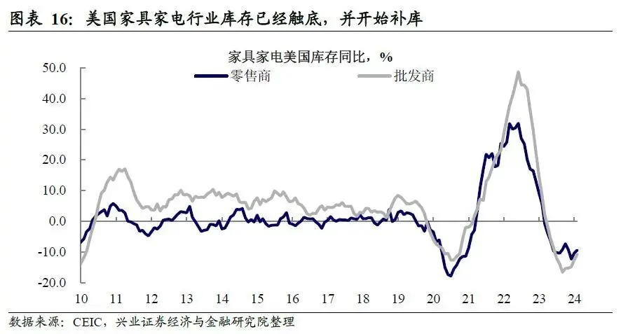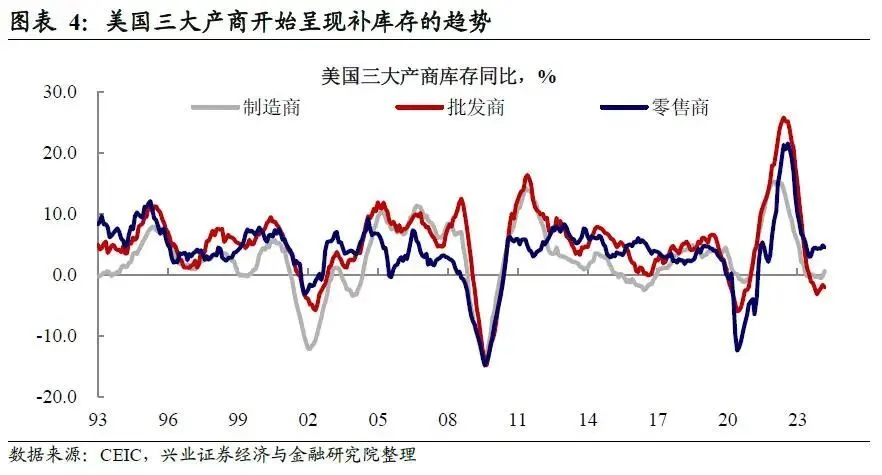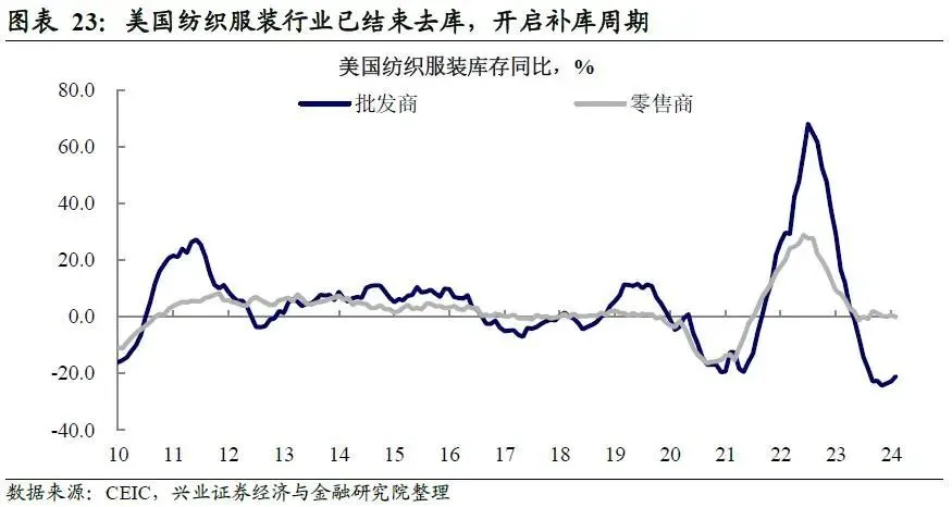 中新经纬5月11日电 题:美国补库周期已开启,中国四大行业或将受益 作者 卓泓 兴业证券宏观团队外洋负责人 彭华莹 兴业证券宏观经济分析师 段超 兴业证券宏观首席分析师 复苏的外洋商品需求将利好中国出口 随着2023年末利率见顶,美国商品需求逐渐上升,和服务业的分化收窄。疫后美国几轮财务刺激带来了2020-2021年间商品需求的快速上行,而后财务刺激的退坡和2022年初开始的加息使得商品需求显着下行,增速跌入负值区间,商品和服务消耗的体现开始分化——商品由于此前已经透支叠加利率敏感,需求显着降落;但服务需求由于劳动力市场强劲的支撑仍有韧性。随着2023年利率见顶回落,商品需求又开始回暖,制造业PMI(采购司理指数)有所规复,此前和服务业部分的分化也大幅收窄。 美国已竣事持续了一年半的去库周期,开始补库。2022年年中开始,美国商品进口增速显着低于商品消耗增速,体现为厂商自动去库存。而2023年底开始,商品消耗增速根本与商品进口增速重合。从三大厂商库存数据来看,美国批发商和零售商已显着开启补库周期,制造商库存也在筑底并有回升趋势。 随着商品需求起来,美国进口开始回升,中国或将从中受益。美国进口增速从2023年7月开始见底回升,此中重要体现为工业品拖累的收窄和交通工具、资源品的正向拉动。按进口经济体来看,东盟和韩国、日本受益显着,美国从中国进口的增速并未持续转正。然而,中国可以或许从美国商品需求回暖中受益。一方面,随着美国商品需求的规复,美国从中国进口贡献的拖累已显着收窄;另一方面,东盟等经济体出口向美国的商品中,必要用到大量从中国进口的中间品,且东盟中间品对中国的依赖越来越强,因此中国也可从中间继承益。 具体来看,装备、家具、纺服等中国出口依赖度高的行业,当前已经出现补库迹象。固然当前中国总体库存水平仍处于震荡磨底的阶段,但部分行业好比化学纤维制造业、家具制造业、通用装备等行业已经进入自动补库存的阶段。这些行业均为轻易受到外需影响的行业,对外部出口的依赖度较高。 机械装备:表里部政策共同提振下的高景心胸 中国的工程机械装备重要出口向东盟、非洲、俄罗斯和中东。机械装备也是出口链上对外需依赖度较高的商品。分经济体来看,中国工程机械装备重要出口目的地为东南亚、非洲、俄罗斯和中东。 2023年以来,工程机械装备对印度、非洲和中东的出口增速较快。近期,印度财务预算在基建方面的投入力度仍在加大,支撑了其对工程机械装备的需求。而中国对非洲和中东的出口增速较快,其背后大概是中国与非洲中东的合作不断深化,以及中国对外绿地投资的建厂需求有关。 对于美国来说,制造业回流大趋势下,美国机械装备库存维持高位。2022年8月拜登政府签订提振国内高端制造业的三大法案以来,美国私人部分制造业投资持续上升,此中制造业制作开支2023年快速上升,这意味着政策支持下,大量制造业相干的厂房进入了制作阶段。制造业回流大趋势下,机械装备并未跟随团体库存周期下行而大幅去库,团体库存增速始终维持高位。 对于中国来说,外需持续叠加国内政策支持,装备库存也维持高增。外需来看,根据此前所述,重点出口地区(东南亚、中东、非洲等)均有基建相干需求,拉动中国机械装备出口;内需来看,3月工信部推出的“装备更新”和“以旧换新”等政策的出台也将推动国内装备的需求。当前中国装备类库存维持补库存趋势,工业增长值也维持高位。 家具家电:中美库存周期共振结果显着 美国、欧盟和东盟是中国家具家电出口的重要目的地。从出口目的地来看,美国、欧盟和东盟是中国出口的告急目的地。 受到前期利率下行的提振,美国家具家电行业已经开始补库。美债利率于2023年见顶,抵押贷款利率的高点已过,当前美国房地产有边际复苏的迹象,新居和二手房贩卖均有边际回暖。从节奏上来看,美国房地产后周期商品消耗是与房地产贩卖同步的,因此房地产贩卖的启动或意味着房地产后周期商品(家具、家电等)需求的同步上升。从库存数据来看,美国家具家电的批发商和零售商库存均已触底回升,开启补库周期。然而,由于房地产是高度利率敏感的部分,近期紧缩预期回摆后美债收益率有所上行,或将对房地产贩卖有所压抑。因此,需鉴戒房地产贩卖震荡下行对房地产后周期商品消耗的扰动。 受外需影响,中国家具制造业也已开启自动补库存。从节奏上来看,美国家具家电行业补库存的时间稍滞后于美国从中国进口家具家电的增速约莫一个季度,且二者有显着的领先滞后关系。因此,家具家电行业中美库存周期可以或许实现共振。在外需的拉动下,中国家具制造业增长值同比快速上行,且库存也有筑底回升的迹象,中国家具制造业也体现为自动补库存的开启。 纺织服装:强生产和高外需下的补库需求 中国纺织服装商品对外出口中,东盟、美国是最大的买家。 美国服装用品销量回升,或将拉动美国零售商开始补库。伴随美国商品消耗需求的回暖,服装等非耐用品消耗也有所上行。2023年年末以来,美国服装类商品零售贩卖有所上行,而汗青经验来看,零售贩卖对于库存有领先性,因此,零售贩卖的回暖或将动员零售商开始补库。当前美国的纺织服装批发商库存已经触底并有补库迹象,零售商库存增速维持低位颠簸。 中国