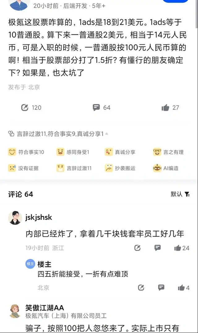 此次上市,极氪的估值不到当初融资规模的一半,极氪的资源局内,究竟谁才是输家,谁是最大赢家? 作者|钱钰 编辑|原野 微信公众号:略大参考(ID:hyzibenlun) 2024年5月10日,祥瑞控股团体旗下极氪智能科技以ZK为股票代码,乐成敲钟。纽交所上市仪式现场,极氪CFO袁璟、极氪董事李东辉、极氪董事及CEO安聪慧、极氪董事桂生悦四位手握股权鼓励的高管,笑得非常开心。 高层开怀大笑的同时,底层的打工人却闹翻了。 有疑似极氪员工的网友在小红书、脉脉、微博等平台发布,参与极氪股权鼓励后亏损巨大的听说。网友声称,极氪股权鼓励(平常股)的行权价高达100元。按照10平常股可换1存托股的比例,1000元才气换股价为28.26美元(204.22人民币)的存托股,“相称于股票部分打了 1.5折?” 制止发稿前,略大参考试图接洽多名发声职员举行求证,但并未得到复兴。 极氪的资源局内,究竟谁才是输家,谁是最大赢家? 01股权鼓励的“悲欢”安聪慧在极氪敲钟现场开怀大笑的缘故原由很简单。 安聪慧1996年加入祥瑞控股团体。以后在祥瑞控股团体继承首席工程师和总司理等多个关键职位,2003年到2011年继承祥瑞控股团体的副总裁,并自2011年12月起被任命为祥瑞控股团体的总裁。安聪慧是祥瑞汽车的实行董事,也是极氪的董事兼首席实行官,是极氪操持的魂魄人物之一。 作为高层,安聪慧得到的期权并不少。 安聪慧得到了6800万股,占发行前总股份的3%,占发行后总股数的2.7%。上表中,极氪披露了安聪慧得到股权嘉奖的数量,但并未披露行权价。 极氪的股权鼓励最早可追溯至2021年,后续履历了多轮的股权变更。但安聪慧仍旧持有3%股权来看,安聪慧早期得到的股权比例并不低,而且代价很大概极低。 安聪慧的行权价可从其他几位高管的股权中窥伺一二。据招股书显示,朱凌的得到平常股相干股权嘉奖的行权价(或买入价),为0.0002美元/股。按照极氪每份ADS对应10份平常股估算,只要高管可以大概行权时极氪ADS的代价在0.002美元/股以上,低价得到期权的高管们便乐成轻松赢利。 综合来看,安聪慧为首的高管“账面收益率”颇高。 制止2023年12月31日,2021年操持下的93011731个RSU(限定性股票单位)已授予并仍在发行,不包罗在相干授予日期后被取消的RSU。故而其他高层也持有肯定股份,但持股比例极低。在招股书中,因安聪慧、李书福外的极氪高管所持有的股份,占极氪已发行股份总数比例不到1%,仅用“*”举行标注。 但,并非全部人都能得到0.002美元/股的行权价。略大参考致电负责极氪电池开辟的雇用职员,该雇用职员表现“大部分(公司)都会有期权,但是具体职员是否有期权以及期权代价,还要看员工岗位的紧张性和公司制度。” 毫无疑问,安聪慧在股权鼓励上“遥遥领先”。极氪将股权鼓励操持进一步分为基于服务期与基于业绩两种。据祥瑞汽车2021年8月关于股权鼓励的公告,“综合思量极氪的定位和中长期发展规划,已确定二零二五年贩卖考核指标为年销量不低于65万辆,二零二五年市场地位考核指标为全球高端智能电动汽车市场占据率到达行业前三。” 呼应一样平常,在祥瑞汽车2023年上半年业绩发布会上,安聪慧也将极氪将来的目标定为“2025年销量到达65万辆”。 对于安聪慧,面前的上市仅是“纸面富贵”,只有比及2025年才气进一步讨论是否“落袋为安”。 02消散的李书福极氪在上市首日,盘中一度较发行价上涨40%。制止美股收盘,极氪首个买卖业务日股价报收28.26美元。 很难确定,李书福看到极氪28.26美元的股价、68.98亿美元的市值是否可以大概笑得出来。 究竟,李书福对极氪的付出并不少。 起首,李书福将极氪作为“亲儿子”打造供应链。在内部,极氪001是基于众多SEA架构研发的。据悉,众多SEA是祥瑞和百度共同打造的,花了近200亿元。别的,极氪的Falcon Eye Vidar鹰眼视觉融合感知系统、车身布局和骨架也都泉源于祥瑞。 其次,李书福在早期就将优质资产并入极氪。2021年10月,宁波威睿51%的股权被极氪控股上海子公司收购。在极氪001推出之前,极氪很大一部分收入来自向祥瑞团体贩卖电池和其他零部件以及研发服务。 纵然在已往一年,李书福都没制止向极氪输送关联买卖业务。据招股书数据显示,极氪在2023年向祥瑞控股提供24.978亿元研发服务、出售84.618亿元电池及其他零部件;2023年,极氪向祥瑞汽车出售32.626亿元电池及其他零部件、向祥瑞汽车关联公司出售了27.303亿元的电池及其他零部件。 李书福在资产端、收入端扶持极氪的同时,不忘在资金端输送现金。 据招股书显示,李书福的祥瑞向极氪输送了113亿的贷款。具体为,于2022年4月浙江极氪与浙江祥瑞汽车制造有限公司签订了为期10年的贷款协议,本金总额为人民币97亿元。2022年11月,子公司宁波威睿(Ningbo Viridi)与浙江祥瑞汽车制造有限公司订立本金总额为人民币16亿元的10年期贷款协议。 末了,李书福还不忘参与极氪新股的认购。 相较三年前,美股市场对汽车的态度转冷。或是为激起各人对极氪的关注度,亦或是为极氪的市值托底,祥瑞汽车在本次发行中已认购12900952股美国存托股,而极氪此次发行了21000000股美国存托股票。换而言之,李书福的祥瑞汽车此次认购占比近6成。 本次发行后,李书福拥有的1951009520股平常股,拥有78.8%的投票权,投票权高度会集。由于得到超额认购,极氪以每股21美元的代价累计发行2100万股ADS,募资约4.41亿美