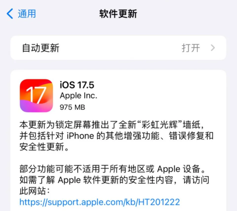iOS17.5正式版苹果在本日突然不按常理来,破晓直接发布了 iOS17.5 正式版系统,按理说应该会在来日诰日才发布的。 不外各人也不消太冲动,iOS17.5 并不是一次大更新,紧张就是为了新 iPad 系列推出而预备的系统。 现在我们就来看看,iOS17.5 到底更新了什么吧! 1:五张全新壁纸 苹果这次最大的更新莫过于就是一次性给了五张全新的自带彩虹壁纸了,这五张壁纸全部都是霓虹彩虹样式。 比力有趣的是,这套壁纸动态效果非常棒,在每次解锁手机的时间,都能有非常炫酷的解锁动画和点亮动画。 2:图书应用调解 现在自带的图书应用也有一些小调解,现在在顶部的阅读进度界面上,之前的进度条变成了圆环外形的。 而且整个图书阅读界面也有了一些渺小的调解,但不影响使用。 3:生疏跟踪提示 之前 iOS 系统只会提示生疏的 AirTag 跟踪,而现在只要是支持苹果网络查找的生疏产物不绝在你身边,你的 iPhone 也会发出告诫。 iPhone 会出现一个弹窗,提示你大概被生疏产物跟踪了,你还可以看到跟踪的轨迹。 除此之外,iOS17.5 正式版似乎就没有什么可以说的新厘革了。 至于更新发起,我之前就说过很多遍了,假如你没有需要的新功能,大概是硬性需求,那么就没有须要去更新系统。 不要指望苹果能给你越更新越流通,越更新越省电,真是想太多了。 |