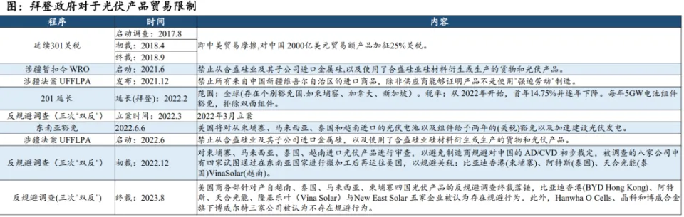靴子终于落地。 5月14日,美国针对中国光伏新能源企业再次挥刀:全面征收处罚性关税。 大选之年好勇斗狠 直接说重点。 本地时间5月14日,美国当局公布,将对代价180亿美元的中国入口征收高额关税。西方主流媒体普遍以为,拜登当局这一选举年的贸易举措,大概会进一步加剧世界两大经济体之间的摩擦。 其中,电动汽车首当其冲。颠末近四年的检察,美国在本年针对来自中国的电动汽车的总关税税率,将从现在的27.5%飙升至102.5%。 锂电池的关税税率,将从现在的7.5%进步到25%,关键矿物的税率将从零进步到25%,太阳能电池及组件的税率将从现在的25%进步到50%,半导体的税率将从 25%进步到50%。 另外,拜登当局此前曾公布,对来自中国的钢铁和电解铝征收关税,税率从现在的7.5%或零,提升到25%。 西方主流媒体普遍以为,美国对华发起新一轮贸易战,是拜登在与朗普之间剧烈选战之下接纳的办法,即两位总统候选人都在比拼,谁对中国更增倔强。 美国当局官员夸大,这项决定与本年11月的美国大选无关。但究竟上是,以上关税步伐将直接影响到宾夕法尼亚州和密歇根州的工人选票——这两个战场州将决定谁终极能赢得美国大选。 这对于本已告急的中美经贸关系影响究竟有多少,现在尚难以断定。据相识,这些新的关税步伐将在将来三年内分阶段实验,并于2024 年生效。 针对美国将向中国180亿美元(约243亿新元)商品加征关税,我国交际部批评美国双重尺度,夸大中方一向反对违背世贸规则单方面加征关税,将接纳统统须要步伐维护自身合法权益。中方表现,美方出于国内政治思量,滥用301关税复审步伐,进一步进步部分对华产物加征的301关税,将经贸标题政治化、工具化,是典范的政治操弄,中方对此表现猛烈不满。世贸构造早已裁决301关税违背世贸构造规则。美方非但不予以改正,反而独断专行,一错再错。 美方进步301关税违背了拜登总统“不寻求打压遏制中国发展”“不寻求与中国脱钩断链”的答应,也不符合两国元首达成的共识精神,这将严峻影响双边互助氛围。美方应立即改正错误做法,取消对华加征关税步伐。中方将接纳坚决步伐,守卫自身权益。 中方的反应实在已在美国的料想之中。 当下影响甚微 重点说一下美国针对入口光伏产物的税率。 特朗普时期对行业影响较大的政策重要是在2018年加收201、301关税,从而进步了美国入口东南亚组件的资本。中国光伏产物对美国出口必要征收“双反+201+301”,东南亚国家仅必要征收201关税。 双反政策是针对中国及中国台湾晶体硅光伏电池征收的反倾销和反补贴税,差别企业的税率经每年复审决定;201关税针对环球电池和组件产物,对每年不超过5GW的电池及全部组件举行关税宽免,2022年税率为14.75%,逐年递减;301关税是中美贸易战引起的对各类中国输美商品征收的25%关税。 仅就光伏而言,实在对于中国企业影响甚微。 据中国海关总署统计数据,2023年,我国对美直接出口“直径≥30cm经掺杂用于电子工业的单晶硅棒”金额为823万美元,“直径>15.24cm的单晶硅切片”为1.19亿美元,“未装在组件内或组装成块的光电池”仅为1290万美元,“已装在组件内或组装成块的光电池”为9295万美元。 受此次关税影响的中国直接出口美国的光伏电池和组件总额,在2023年合计仅为1.06亿美元。 2018 年起,美国入口组件中来自东南亚的占比敏捷上升,2023年美国光伏组件入口中,东友邦家的占比到达 87%以上。东南亚光伏产能重要由美国需求消化。据彭博新能源财经统计,2023年,美国入口光伏组件高达50GW。 2023年1-11月美国组件入口国份额;泉源:BNEF 2018 年起,美国针对入口光伏电池与组件开始征收201条款关税与301条款关税。201 关税实用范围涵盖环球大部分国家,当中包罗越南、马来西亚、泰国等东南亚光伏制造大国,现在实用的税率是15%,而301关税仅针对中国——即上面的2023年1亿多美元出口美国的光伏产物。 2022 年6月,拜登当局给予东南亚四国的组件与电池为期两年的反规避关税缓冲期,到本年6月6日到期,且不会连续。 头部光伏企业已做好准备 针对美国大概针对中国光伏产物的新一轮贸易办法,中国光伏企业已经做好充实准备。 针对美国贸易政策的不确定性,阿特斯表现,关于美国对东南亚地区反规避宽免期到期事件,行业内不绝是有预期的,大多数头部企业提前布局了东南亚辅材产能或硅片产能来满足持续的宽免条件。因此,该政策宽免期竣事后影相应该不大。关于东南亚“双反”标题,中国光伏企业应对“双反”已经是身经百战,从2010年就开始应对各种反倾销和反补贴。 晶科能源在继承类似调研时亦表现,美国对华光伏产物的贸易政策存在不确定性,晶科也做了相应准备。公司在美国投资建设2GW 组件工厂,对将来美国出货会有资助。从汗青来看,政策端的变革会反应到组件终端代价中,以是预判一方面本年美国的短期需求大概加速,另一方面由于美国本土产能相对不敷,政策变革后美国市场组件代价可能会进一步上升。 天合光能表现,美国是公司告急的地区市场,也是天合的上风市场,2023年公司在美国的业务收入到达108亿元,同比增长99%。2024 年公司在美国市场的出货目的为7GW 以上,继承实现高增长。面临美国市场的贸易政策不确定性,天合依附前瞻性的环球视野,以及外洋产能的预先布局,已经创建了一套有效的应对机制。公司有本领满足美国市