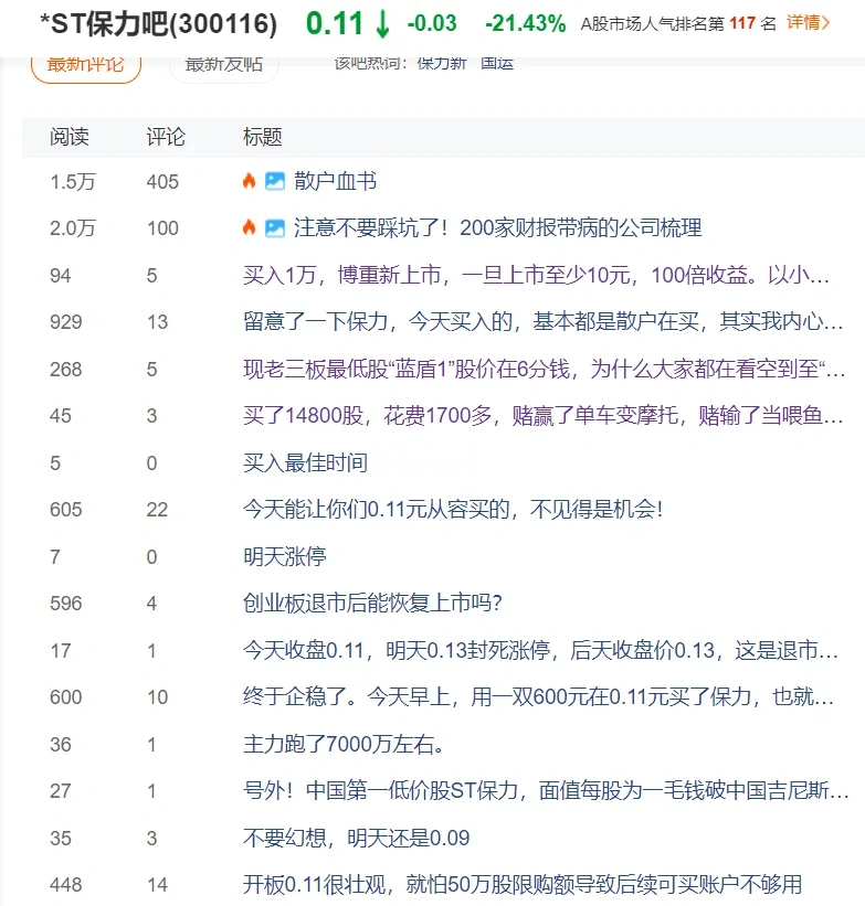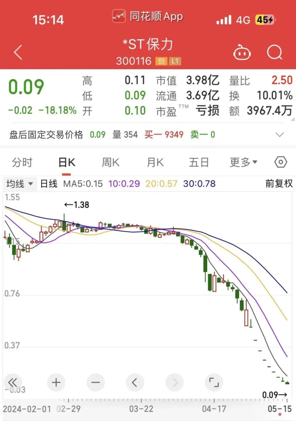 5月14日,连续20cm“闪崩”的*ST保力再度大跌,近8个生意业务日累计重挫近83%,其股价也仅剩0.11元。 15日,克制收盘,*ST保力股价跌18.18%,报0.09元,为现在A股市场中的最低股价。 有股民称:买了14800股 赌赢了单车变摩托 *ST保力股票生意业务自4月29日起被实行“退市风险警示”和“其他风险警示”,股票简称由“保力新”变动为“*ST保力”,该公司股票生意业务于4月29日停牌一天,于4月30日开市起复牌。 4月29日,公司披露的2023年年度审计陈诉表现,2023年整年,该公司实现业务收入1.36亿元,归属于母公司所有者的净亏损为1.88亿元。 财报发布后,4月29日,厚交所曾向该公司下发了年报问询函,要求其说明是否存在捏造生意业务事项、捏造收入等情况。 5月14日,保力新能源科技股份有限公司(简称“*ST保力”或“保力新”)发布的公告表现,克制当日,该公司股票收盘价连续十八个生意业务日低于1元,即使后续2个生意业务日(不包罗该公司股票全天停牌日)连续涨停,也将因股价连续20个生意业务日低于1元而触及生意业务类退市指标。 固然已经提前锁定退市,但值得注意的是,5月14日,*ST保力的资金交投活泼度却不低,全天成交额近8000万元,大幅高于月内均值程度(1800万元)。从其当日龙虎榜数据上看,“拉萨天团”成为入场主力,买入榜前五席位中四席为东方财产证券拉萨相干业务部,合计净买额近186万元。而在卖出榜前五席位中,一家机构席位净卖出近905万元,深股通席位也净卖出近133万元。 在*ST保力的股吧中,小散留言潮涌。有投资者发帖表现,“买入1万,搏重新上市,一旦上市至少10元,100倍收益。以小博大。究竟这是新能源”;另有投资者表现,“买了14800股,泯灭1700多元,赌赢了单车变摩托,赌输了当喂鱼了”。 理性的声音也并未被淹没。有人表现,“创业板退市后能规复上市吗?”;另有人称“不要抱负,来日诰日还是0.09”。 15日,另有股民称来日诰日希望7分再收一万手。 另有”看热闹“的股民称:“买100股才10块钱,感受一下一跌就50%的快感。” 接盘的女富豪业绩答应到期 被索要7.3亿元补偿金 资料表现,*ST保力前身是坚瑞消防,公司于2010年在厚交所创业板挂牌。2016年,同心专心转型的坚瑞消防以6倍估值的超高溢价52亿元,收购沃特玛股权进入动力电池及新能源汽车范畴。彼时,沃特玛还是国内新能源电池巨头,是国内较早一批开展研发新能源汽车动力电池,并实现规模化生产和批量应用的企业之一。 收购沃特玛之后的一段时间内,趁着新能源汽车行业的东风,*ST保力实现了业绩暴增。2016年当年,公司实现红利4.25亿元,同比增长11.03倍;2017年前三季度,公司实现净利润7.55亿元,同比增长8.03倍。然而进入2017年第四序度,尤其是2018年之后,*ST保力的连续出现亏损,2017年、2018年公司净利润均亏损高出36亿元。 这桩巨额重组之后没多久,沃特玛渐渐从神坛跌下。2019年11月13日,广东省深圳市中级人民法院发布《关于深圳市沃特玛电池有限公司破产整理案选任管理人公告》,标志着沃特玛进入破产整理程序。当晚,沃特玛母公司坚瑞沃能(300116)发布公告,确认了上述信息。 2020年,沃特玛被剥离上市公司体系,公司也更名为保力新。但之后公司的经业务绩未见好转,2020年至2023年公司净利润连续4年亏损。2024年4月29日起,公司股票被实行“退市风险警示”和“其他风险警示”,股票简称由“保力新”变动为“*ST保力”, 据证券时报统计,在公司净利润创新高的2016年,*ST保力当年股价也创下汗青高点,彼时A股市值一度高出135亿元。克制5月14日收盘,该股收盘价较汗青高点回撤96.89%。 wind数据表现,*ST保力累计直接股权融资约72亿元。上市以来共亏损近75亿元,累计现金分红不到2000万元。 公开资料表现,保力新原创始人是郭鸿宝,从前间,郭鸿宝的个人履历颇为励志——为了创业脱离体制、放弃工程师的工作,建立坚瑞消防,至2010年登岸创业板。 但就如前文叙述的那样,上市数年后,坚瑞消防要转型新能源汽车行业。2017年,受诸多新能源车企骗补、政策补贴退坡等影响,加之公司对收购沃特玛时所形成的商誉计提了全额减值,当年坚瑞沃能巨亏37.34亿元。 但这次郭鸿宝并未选择再找下一个风口。wind数据表现,2017年9月至2018年9月,郭鸿宝等股东频仍减持,套现数亿元。 2020年4月29日,坚瑞沃能重整筹划实行完毕,常德复兴【后更名为常德新中喆企业管理中央(有限合资)】成为第一大股东,实在控人高保清亦成为上市公司现实控制人,公司更名为保力新。而作为创始人的郭鸿宝,于同年5月辞去在上市公司的所有职务。 据新京报报道,1956年12月出生的高保清,是陕西省绥德县人,1973年参加工作。她曾出任甘肃省白银市白银区政协委员、工商联副会长,湖南省怀化市人大代表、常德市工商联副会长等职。继承媒体采访时,高保清对外报告,她于1988年开始下海做商业,入主湖南中锂,也是“听说这里有个有前景的新能源项目”,厥后才发现这家公司账上不到5万元,员工连续7个月没有发工资。为了筹钱,她曾将长沙的别墅抵押,在银行贷不到款的时候,通过财鑫金控得到500万元。 而前老板郭鸿宝则在2020年1月、2021年4月~7月,2022年5月~8月等时间段多次减持。克制2022年底,郭鸿宝在上市公司持股比例到达2.65%。 值得注意的是,当初坚瑞沃能重整时,常德复兴曾答应,自2020年1月1日至2022年12月31日期间发行人扣除非常常性损益后的净利