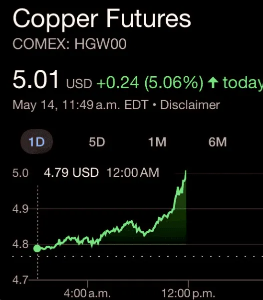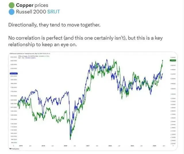 北京时间周二晚23:50分,美国交易业务时段,纽铜出现逼空行情。 上述逼空行情发生在7月的Comex合约。 周二,LME期铜收跌72美元,报10114美元/吨。伦铜主连盘中下跌1.2%。沪铜收跌0.94%。 7月纽铜的暴涨,也推动Comex市场出现亘古未有的期货贴水:7月合约比9月合约每磅高出29.25美分。 “纽铜逼空亘古未有” 交易业务员们当日表现,本日的纽铜逼空亘古未有,使得铜货船被转运至美国。 对于纽铜7月合约的逼空,业内人士指出,在铜期货上做空价差或是直接做空7月纽铜期货合约的交易业务者,面临庞大损失并被迫补仓。 须要分析的是,虽然COMEX 7月期铜盘中曾涨近5.5%,涨至5.026美元,距2022年3月俄乌辩论早期所创的盘中最高纪录5.0395美元一步之遥,但周二纽铜7月合约的逼空并没有很连续,此后该合约涨幅显着收窄,收涨2.7%,报4.895美元/磅,连续两日创两年来收盘新高,迫近2022年3月4日所创收盘汗青高位。 周二同日,智利政府上调铜价预期,预计2024年铜价为4.2美元/磅,之前预计为3.84美元。 纽铜之以是出现逼空,大背景是铜的供需趋紧。 铜价本年以来连续走高。4月下旬,LME期铜价格自2022年以来首次突破1万美元/吨。 究竟上,在美国,飙升的铜价已经让普通大众切身感受到了:旧金山已经有人堵截特斯拉电动汽车的充电线缆,将内里的铜线作为有色金属出售。 另有网友留意到了铜价和美股小盘股的基准股指罗素2000之间的高度干系性: 随着行业供需缺口继承扩大,市场广泛预计将连续推动铜价上涨。 高盛此前在陈诉中将铜的本年年末预期价位从1万美元/吨上调至1.2万美元/吨,整年均价预期从9200美元/吨上调至9800美元/吨,维持2025年均匀1.5万美元/吨的推测。 而一些分析师告诫称,铜价已进入完全超买地区。