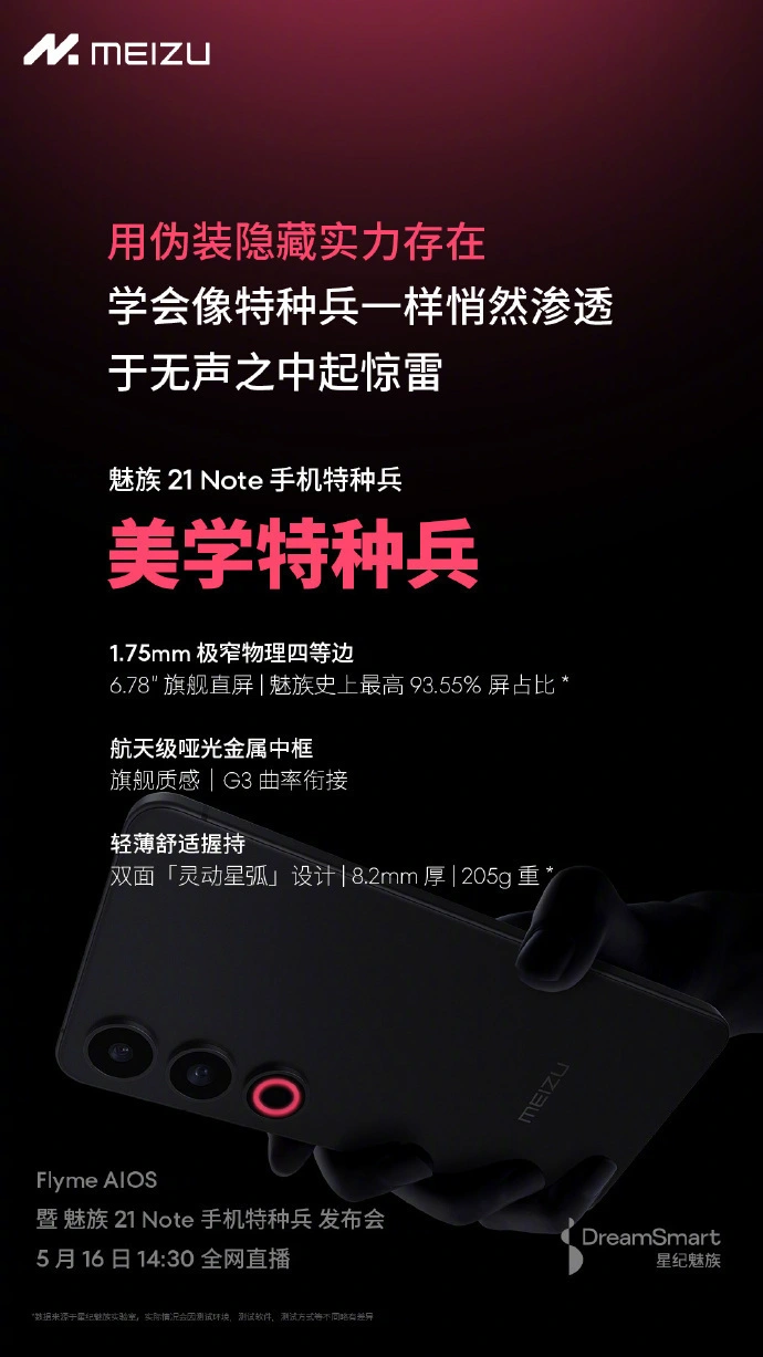 魅族已经官宣,将于2024年5月16日14:30,也就是本日14:30召开Flyme AIOS暨魅族21 Note手机特种兵发布会,发布魅族21 Note手机。发布会开始前,魅族曝光了魅族21 Note的表面参数。 据了解,魅族21 Note机身正面将搭载6.78英寸旗舰直屏,屏占比高达93.55%,而且拥有1.75mm极窄物理四等边。魅族21 Note采用航空级哑光金属中框,厚度仅为8.2mm,,整机重量仅为205g。 性能方面,魅族21 Note将搭载高通骁龙8 Gen2处理器,辅以16GB内存,内置5500mAh大容量电池,支持66W快充。别的,魅族21 Note还搭载360度立体散热系统,VC均热板面积为5000mm2。 |