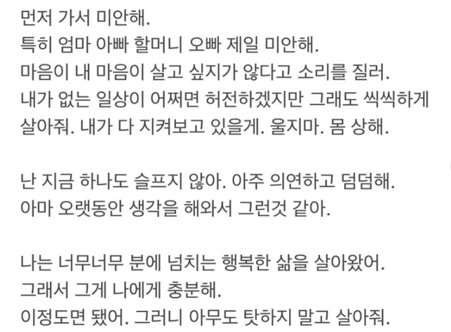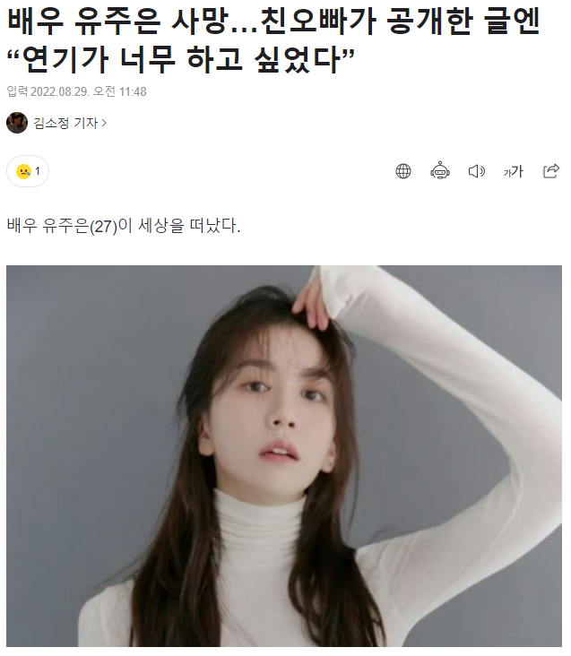 8月29日,韩国女演员刘珠恩自尽去世,年仅27岁。 29日上午,刘珠恩的哥哥通过外交平台透露死讯:“2022年8月29日,珠恩离开这里,去了舒服的地方,偶然间的人请在珠恩去的路上打招呼。”哥哥表如今公开这段笔墨是刘珠恩生前交接的,同时替她感谢朋侪以及喜欢她的观众,特殊是特殊感谢刘珠恩的老师,坦言刘珠恩一点都不伤心,竣事的时间很淡定、很坚贞:“对不起,我先走了。” 据媒体报道,刘珠恩以极度的方式离开(自尽),并留下一封遗书,表现对不起爸爸、妈妈另有哥哥及奶奶,她没有生存下去的渴望,称非常想演戏,演戏大概是她的全部,但是生存并不轻易,除此之外什么都不想做,让刘珠恩非常绝望:“带着绝对无法忘记的追念对峙到了末了,我以为本身的人生是乐成的人生。” 刘珠恩出生于1995年,2018年出演电视剧《Big Forest》《朝鲜生存记》《没有第二次》等多部韩剧,长得漂亮身材又苗条出众,明显有着大好出息却忽然放弃。 4月26日,刘珠恩分享了末了一组自照相,先是对着电梯照相,然后下楼录下小区景致,接着哥哥用手机拍下她荡秋千的镜头,末了露面则是刘珠恩与狗狗玩耍,手捧脸笑脸光辉光耀。 韩国演艺圈自尽率奇高,客岁就有23岁女星赵河娜不堪网暴自尽,国内比力认识的女星包罗雪莉、具荷拉、李恩珠、张紫妍、崔真实等皆在30岁左右自尽。与刘珠恩名字相近的李恩珠,曾出演韩剧《火鸟》走红,自尽时年仅24岁。 没想到刘珠恩也步李恩珠后尘,以极度的方式离开。 从刘珠恩的外交平台来看,她的工作量不多,与家人的关系也很和睦,近期也没有遭到网暴和恶评,却不知为何会选择自尽。家人透露,刘珠恩的灵堂设在京畿道水原市亚洲大学医院的殡仪馆,出殡的时间是8月31日,也愿她一起走好。 |