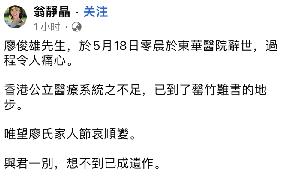 香港演员廖骏雄本日破晓于东华医院辞世,享年63岁。 廖骏雄好友、曾一起主持节目《伤害人物2.0》的翁静晶在外交平台写道:“廖俊雄老师,于5月18日零晨于东华医院辞世。” 同时她向传媒转述廖骏雄妻子的话指:“院方人手不敷问题,过程受到很多多少痛楚。香港公立医疗系统之不敷,已到了罄竹难书的地步。” 她亦希望廖氏家人节哀顺变,“与君一别,想不到已成遗作。” 传媒询问翁静晶医院问题是指什么方面,她则复兴不方便多说,让记者联结廖骏雄家人再相识。 廖骏雄艺名骏雄 ,第8期无线电视艺员练习班毕业,班中同砚有艾威、陈安莹、景黛音及李成昌等等。 廖骏雄80年代凭TVB经典剧《天师执位》中扮演“大粒癦”一角而为人熟识。 廖骏雄生前曾受访说,那时跟汤镇业最老友,汤住南丫岛,廖住上水,末了两人在广播道租了一间房一起住,故常常见汤镇业跟翁美玲一起,还常常有晤面一起用饭。厥后翁美玲离世,他亦深感痛惜。 别的他还参演了《 北斗双雄 》 《射雕豪杰传》《成吉思汗》《天地男儿》《鹿鼎记》等经典港剧。 《北斗双雄》 由周润发主演,廖骏雄扮演“癫马”,同剧另有周星驰、梁朝伟及任达华等。 剧集《薛人贵征东》骏雄扮演董逵,当时正值电视台大战,此剧奉命出战撼收视。 廖骏雄追念:“这部剧打到每天头懵,试过捱到顶不住患肝病。” 廖骏雄也在《猛鬼差馆》《富贵再三逼人》《我未成年》等香港影戏中有过演出,与梅艳芳、张学友等巨星都有对手戏。 骏雄90年代后期赴马来西亚发展,厥后从商,亏损负债百万;之后转开商业公司,半退休后间中客串影戏及剧集客串,又不时跟跟周润发一起爬山跑步,练出健硕身型。 2021年,跑山队友廖启智因胃癌病逝,同年4月廖骏雄亦发现本身患同一个病,发现时已是第四期,需要切走半个胃保命,并继承化疗,体重由病前210磅一度暴跌至160磅。 廖骏雄22年曾继承媒体专访谓:“从前成日同发哥跑山,如今没有了,不够气跑什么鬼。化疗完不够气,走久了轻易累,要回家苏息。等成个疗程完了,养好身材再想。” 惋惜养病三年,廖骏雄终极还是不敌病魔离世,惟愿这位老戏骨一路走好! |