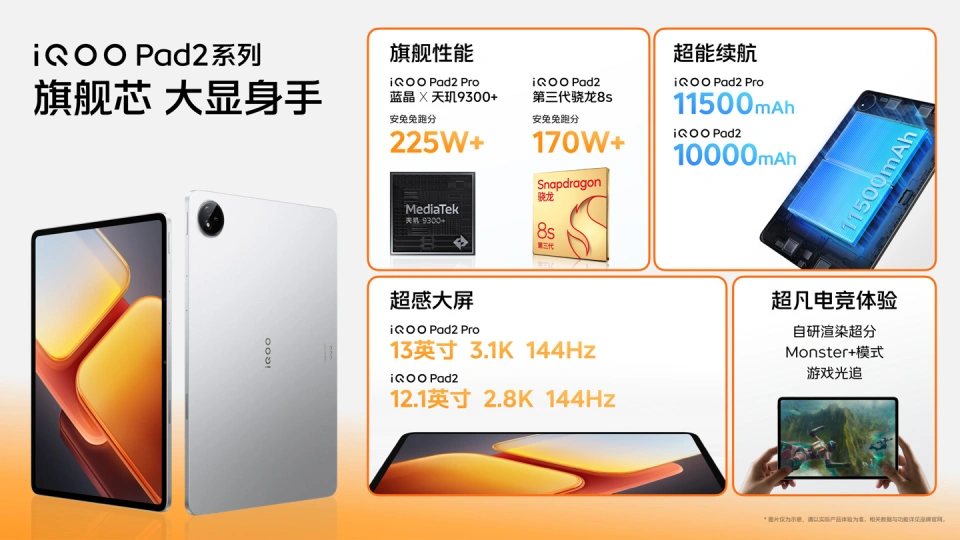 IT之家 5 月 20 日消息,除了 iQOO Neo9S Pro 手机外,今晚 iQOO 还发布了 iQOO Pad2 系列平板电脑,包罗 iQOO Pad2 和 iQOO Pad2 Pro 两款产品,现已开启预约,5 月 31 日 20:00 全渠道预售,具体售价暂未公布。 iQOO Pad2 采取 12.1 英寸 2800*1968p 2.8K+144Hz LCD 屏幕,拥有 600nit 至高亮度,通过了莱茵低蓝光认证。搭载骁龙 8s Gen 3 处理惩罚器,内置 10000mAh 电池,可在线观影 11.5 小时,支持 44W 快充。影像方面,搭载 5Mp 前置摄像头和 8Mp 后置摄像头。 iQOO Pad2 Pro 采取 13 英寸 3096*2064p 3.1K+144Hz LCD 屏,拥有 900nit 至高亮度,通过了莱茵低蓝光认证。搭载天玑 9300 + 处理惩罚器,内置 11500mAh 电池,可在线观影 14.8 小时,支持 66W 快充。搭载 Monster+8 扬声器,支持无指纹解锁、多装备通讯共享、USB 3.2 Gen1。 此外IT之家注意到,两款产品均搭载自研立体散热体系,散热服从至高提升 30%;自研渲染超分,画质至高达 1700P;另有 Monster + 模式和《暗区突围》光线追踪技术。 |
