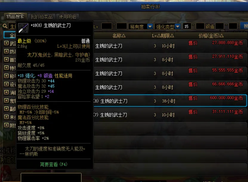 DNF这游戏的武器装备种类非常的多,每个职业的武器装备都不尽类似,尤其是每个职业根本上都是有着专属武器的,就像是剑魂的专属武器是光剑一样。而地下城这游戏的职业种类也黑白常多的,这也就作育了这游戏巨大的装备总量了。现在地下城连神话装备都有了,固然史诗装备并没有因此而被镌汰,但史诗装备的地位却也因此而降落了一个档次,这就更别说是其他更低级风致的装备了。 曾多少时,这蓝装武器也是在地下城中占据一席之地的,尤其是当年的蓝装双雄,朱诺星剑和实行巨剑。这两把武器固然是蓝装,但在当年谁人特别的环境之下,这两把蓝装武器的性价比那可真的黑白常高的,可以说是布衣神器了。尤其是这实行巨剑强化到20以后,其属性也是全服数一数二的,当年的强化还没改版,这强化数值的提升照旧很可骇的。这一把强化23的实行巨剑当年都能卖出好几万的天价了,纵然现在这么多年已往了,强化也改版了,但这蓝装纵然当垫子也是很有代价的。 这不就有玩家亮出一把三级武士刀扣问各人代价多少,这名玩家也是一名脱坑了很多多少年的老玩家了。这次回归竟然在仓库中找到了这把生锈的武士刀,而这把三级武士刀可就有点不同寻常了啊。固然作为一把最低级的白装武器,其属性非常一样寻常,但其强化品级竟然高达20,这强化20的三级生锈的武士刀各人也照旧没见过多少啊。 固然这武器到底照旧一把白装武士刀而已,但当这武器强化20以后其代价可就不一样寻常了啊。要知道dnf这游戏的强化体系可黑白常坑的,要想强化成功最紧张的照旧得看运气了,纵然是土豪如旭旭宝宝也不敢说强化必成功。相比之下,dnf手游的强化保底不碎不掉级的强化机制简直不要太本心。而这也是导致地下城这游戏的高强扮装备非常的少,这高强化品级的武士刀也是有价无市啊。 许多大区的拍卖行最高强化品级的武士刀也不外才18而已,而这强化18的武士刀也是被卖到了6亿金币的天价。 为此有土豪也是出价八亿金币预备收购这把武士刀,但面对这土豪开出的天价,这名玩家却是直接讽刺了,这还没睡醒呢?这也是直接拒绝了这名土豪的开价了。 随后没多久这名玩家本身就给这把强化20的武士刀挂出了一万块的代价,对于这个代价说真话却是是有点高的。固然地下城这游戏最不缺的就是土豪大佬了,但究竟土豪也不是傻的啊,有钱也不会乱花的。 其着实最早强化还没改版的时候,这强化20的武士刀增加的无视防御攻击力也是很可骇的,带上这武器在pk场那真的是可以秒人的存在。那时候还真的是有大概卖到上万块,但现在这武士刀只能看成是玩具大概是垫子了,其代价不会很高的。 |