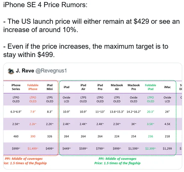 据爆料,iPhone SE4 在美国的售价相比上代要高出 10%,也就是从之前的 429 美元,提高到 469 美元。