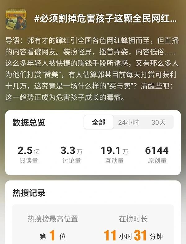 “菏泽树哥”郭有才,因为翻唱歌曲《诺言》而走红网络,成为新的征象级网红。然而在各大网络平台上,唱歌主播成千上万,为何只有郭有才忽然成为各人关注的焦点,迎来破天荒的富贵? 起首,是郭有才自己自己的缘故起因。郭有才13岁时便“独闯江湖”,尝试过许多行业,结实不拔的郭有才饱经苦难却意志坚定,追求空想永不放弃的精力值得各人学习,草根逆袭的励志少年形象是年轻人的榜样。 其次,郭有才的女友不绝对他不离不弃,从不嫌弃郭有才贫苦,跟着他一起创业打拼。丈母娘也非常支持郭有才,没有向他要彩礼,他们的婚恋观正是现在我们急需的积极向上正能量。 末了,不清除有资源在幕后运作的大概,不外这就不是那些平凡网红可以大概做到的,资源和配景上风不是谁都有的。 厥后郭有才的爆火吸引了来自天南地北的各路博主,把沉静多年的菏泽南站酿成了网红打卡圣地,各种穿着奇装异服的博主搔首弄姿群魔乱舞,乃至有人为了流量毫无下线,局面极其辣眼睛。 除了成年人跟风模拟,造成肯定的不良影响以外,更紧张的是对我们故国将来青少年产生的影响。 有的孩子大概以为只要可以大概成为网红,就可以赚大钱发大财,这比辛劳读书更有勾引力。孩子们今后失去对学习的兴趣,陷入不切实际的抱负当中,这才是最可骇的。 乃至有媒体犀利批评道:“必须割掉危害孩子这颗全民网红毒瘤”! 那么郭有才错了吗?他没有偷没有抢,靠自己的双手奋斗打拼,从一个平凡人发展为本日的网红名流,他并没有教唆别人模拟自己。 就像有位老板开饭店赚了钱,然后就有人跟风也开饭店一样。可惜模拟者动起歪心思,在食材上偷工减料,不专心经营,坑害消耗者,末了不光自己没赚到钱,还给自己招来骂名,那么这又该怪谁呢? 事实上即便没有郭有才,那些博主也会想尽别的办法蹭流量,继续自己小丑式的表演。 中国有句古话叫“闷声发大财”,可是网红却恰恰相反,越有声势越能赢利。然而更加可悲的是,这个“声势”不肯定是正面积极的,“黑红也是红”,这才是令各人苦恼的题目。 当一个赢利的方法被众人所熟知,各人都跟风模拟时,终极受益的绝对不是你我平凡人,大部分人都只是炮灰而已。成年人的天下里,自己要学会分析判断。 别的郭有才的成才之路固然励志,但着实是无奈中的无奈,先有了不应有的苦难,后有了举行反抗的郭有才,这属于个别案例。 正常环境下,孩子们应该在校园里好好读书,作育自己的各项技能,通过学习改变运气。他们应该拥有良好的发展环境,而不是像郭有才那样坎坷坎坷。 也就是说,郭有才这个“正面课本”并不完美,不符合主流代价观,不符合大部分人的环境。 那么郭有才华走多远?综合以上分析,着实效果并不乐观,您以为呢? |