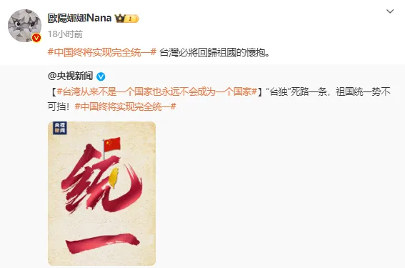 【环球网报道】据台湾中时消息网5月22日报道,央视消息官方微博22日发布一则贴文,内容提到“‘台独’绝路一条,故国同一势不可挡!中国终将实现完全同一 ”。该媒体留意到,许多大陆明星相继转发相关贴文亮相,不少台湾艺人也转发,其中包罗欧阳娜娜、侯佩岑等人。 侯佩岑(左)、欧阳娜娜(右)。台湾中时消息网报道配图 报道称,央视消息官方微博22日一早发文,持倔强态度。贴文写道:“台湾从来不是一个国家也永久不会成为一个国家,‘台独’绝路一条,故国同一势不可挡!中国终将实现完全同一 ”。 《连合报》报道称,这则贴文刹时就登上微博热搜榜,大陆不少一线明星先后转发,岛内艺人侯佩岑、欧阳娜娜也转发贴文,内容是“#中国终将实现完全同一#台湾必将回归故国的度量”。 欧阳娜娜微博截图 侯佩岑微博截图 岛内亲绿媒体《自由时报》留意到,网友见状立即歌颂“好棒,佩岑姐姐勇敢表明态度”“姐姐从始至终头脑同一,我们爱的精良的姐姐”。 还有网友表现,“给侯主播点赞,不愧是我喜欢了20年的女人。”“‘台独’绝路一条,同一势不可挡!姐真棒。” 欧阳娜娜的粉丝也在贴文底下力挺,有人留言表现,“好感动啊,Nana真的很勇敢!”“支持台湾各界人士大胆高声!中华民族不可分割。” 5月20日,赖清德就任台湾地域向导人,而且发表了就职发言。国台办发言人表现,台湾地域向导人的发言通篇充斥着敌意与寻衅、谎言与诱骗,“台独”态度更加激进冒险,放肆宣扬所谓“主权独立”“两岸互不从属”“台湾住民自决”中分裂谬论,尽力恳求外部权势撑腰打气,妄图推动“台湾题目国际化”,继续“倚外谋独”“以武谋独”,可谓是一篇彻头彻尾的“台独自白”。这充实证实,其是岛内主流民意的叛逆者、台海及地域和安稳固的粉碎者。 |