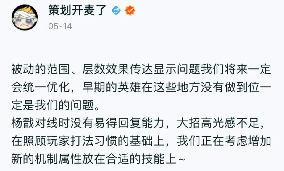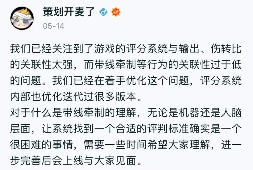 而在5月14日,筹谋也表示会优化评分体系,让带线管束这个举动可以加更多的评分,使得刺客和兵士在后期,即便不刷伤害都能包管拿到MVP。