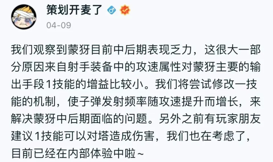 而在4月9日,筹谋也表示会对蒙犽进行“变异”重做,重点是让一技能的发射频率,可以随攻速而发展,类似于虞姬的一技能那样,有更高的施法频率大概速率。