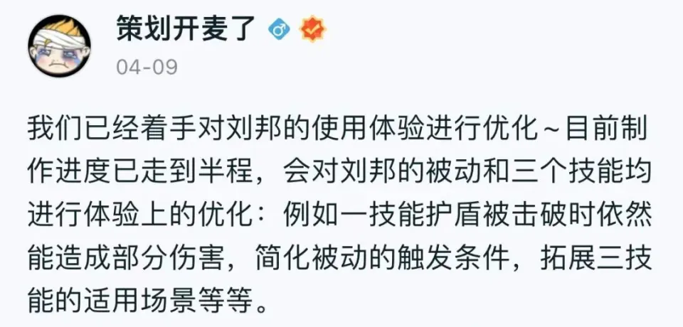 而在4月9日,筹谋也表示后续会对刘邦进行优化,重要是一技能的护盾被击破时,仍然能造成伤害,别的,大招还拓展了实用场景。