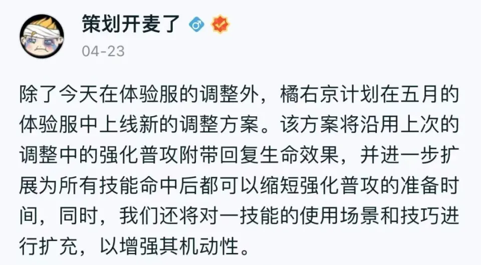 而在4月23日,筹谋也表示会在五月的体验服更新中,对橘右京进行再次改动,重要是在保存原有改动的底子上,继续补强。