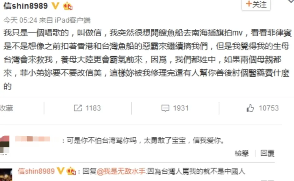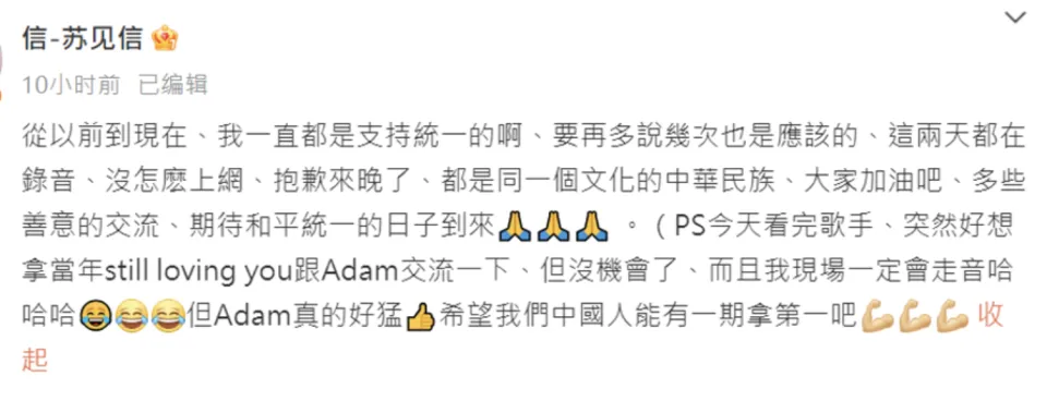 近来,很多台湾省艺人纷纷表态,体现支持故国同一。 而一直在开演唱会的五月天阿信,就在鸟巢演唱会上,在十万人面前说“我们中国人嘛,来北京肯定吃烤鸭的,还要吃什么呢”,一句话引爆全场尖啼声。 这个片断发酵后,很多网友以为五月天亲口说的话,比任何转发都实着实在,“阿信 我们中国人”也刹时成热搜。 而在这之后,来自台湾省的另一位“信”,也出来发声了。 就是前信乐团的苏见信,他发文说“从从前到现在,我一直都是支持同一的啊,要再说多反复也是应该的,这两天都在灌音,没怎么上网,抱歉来晚了,都是同一个文化的中华民族,各人加油吧,多些善意的交换,等待宁静同一的日子到来。还提到自己看了《歌手2024》,很想和亚当交换,但自己在现场肯定会走音。“盼望我们中国人有一期能拿第一吧”。 这番话,比只是纯转发要朴拙太多,可以想见信说出这番话的画面感。 而且他说的没错,“再说多反复也是应该的”,之前他就曾转发过微博支持“一个中国”。 2016年他还曾发文说,“很想开艘船去南海插旗拍mv,看看菲律宾是不是像和之前扣香港和台湾渔船的恶霸继承来搞我们,但是我以为我的生母台湾会来救我,养母大陆会霸气前来,由于,我们都姓中,如果两个母亲都来,菲小弟你要不要改姓美”…… 当时品评区也有网友说“你不怕台湾骂你吗”,他霸气复兴:“台湾人骂我的就不是中国人”。 这些年,信的一样寻常有很多时候都是在内地度过的,在北京也有了一群好朋友,包罗汪小菲等。 而一直说自己不喜欢用手机的他; 为了要用行程码这些,也频仍地用手机,玩手机上瘾了。 然后渐渐变得爱刷短视频,还在微博成为话痨,时不时就上微博分享自己的一样寻常。 冬至了他说X‘max是老外过的,我们来个happy winter solstice day。 有段时间他在湖南录综艺,还传出他定居湖南的消息,被拍到他不苟言笑地在学开电动三轮车,要考据呢。 但实在他大部分时候照旧在北京,只是会由于工作等到处跑,时不时也会去各地旅游。三月份的时候,他还在北京发薄暮的风景。 有一次回台湾,他还被人叫“马栏山舞王”,信就乐呵呵来发微博和各人分享了。 5月13日还在北京见苏有朋,学会了修图,已经成为玩手机的“老手”了; 5月23日他的ip又表现在台湾省,照旧一样的爱吃东西。 他之前由于不消手机而很少和外界交换,现在喜欢用手机上网了,反而常常会和各人分享自己的一样寻常,发文都非常朴拙自然,充满活人感。 碰到有大事的时候,他也会直接表明自己的态度,如许的苏见信,相当圈粉。 那就祝这位爱吃爱玩的马栏山舞王,越来越好!哥照旧要多调养嗓子啊,各人照旧很等待看你的演出的,啥时候能上《歌手》救救那英呢? |