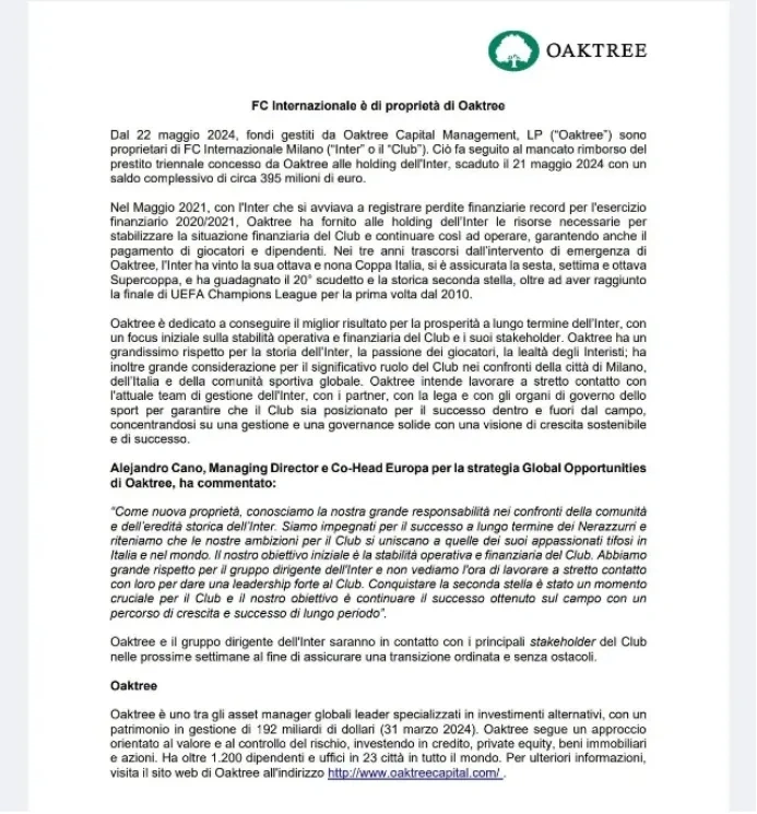 文|《中国企业家》记者 李晓天 编辑|姚赟 图片泉源|视觉中国 这一天终于还是来了。 5月22日,橡树资源公告,由于张康阳未能按时偿还为期3年、总额3.95亿欧元的债务,由其全部的国际米兰足球俱乐部(下称国际米兰)正式易主。 这意味着,国际米兰8年的苏宁期间,被彻底画上一个句号。随着苏宁和张家父子出局欧洲足坛,曾在欧洲五大联赛风光一时的中资目前仅剩两家——复星在英超的“狼队”和当代明诚在西甲的“格拉纳达俱乐部(下称格拉纳达)”。如今当代明诚已“披星戴帽”,格拉纳达处在被放养的田地,随时大概寻求出售;狼队则相对稳固,固然有消息指出复星预计抛售葡萄牙商业银行股份在内的多处外洋资产,但狼队暂不在此中。 国际米兰最新发布的社媒照片中,橡树资源已进驻俱乐部,不见张康阳的身影。在他离开国际米兰前的末了一场比赛,球迷在主场梅阿查球场的看台打出了“感谢斯蒂芬”(斯蒂芬为张康阳英文名)的巨幅标语。要知道在欧洲足坛,球迷与俱乐部管理层不停针锋相对,球迷自发为俱乐部主席“送行”并不多见。 2016年6月,苏宁以2.7亿欧元收购国际米兰68.55%的股份;同年,苏宁选任的5人代表团进驻国米董事会,张康阳任主席。1991年出生的张康阳,是前苏宁控股团体董事长张近东之子,也是国际米兰历史上最年轻的主席。25岁的他第一次出席国际米兰股东大会就放出豪言:“我们来了,就做得到。” 现如今,只余唏嘘。 注定的结局,3年连本带息偿还3.75亿欧元2021年,张康阳从美国基金橡树资源得到了一笔为期3年、年利率12%、总额2.75亿欧元的贷款。对于张康阳执掌的国际米兰来说,这笔乞贷称得上孤注一掷。 乞贷前,国际米兰的财务状态已陷入逆境。从国际米兰公布的财报来看,2020/21财年俱乐部营收3.647亿欧元,录得亏损2.456亿欧元。在橡树资源的公告中也明白提到了这一点:“国际米兰在2020/21财年录得亏损创造了历史纪录,橡树资源提供了球队继续经营所须要的须要资金。” 至于一家百年权门为何会陷入云云逆境,张康阳大概要从表里找题目。 于内,居高不下的球员工资额拖垮了球队。据《米兰体育报》统计,国米2020赛季一线队球员税前薪资总额已经高达1.97亿欧元,在意甲联赛当年仅次于拥有天价薪资的C罗的尤文图斯,比同城死敌AC米兰高出8200万欧元。以至于赛季竣事时,张康阳亲身说服球员和锻练放弃2个月工资,遭到了同等拒绝,但国米方面也无力付出工资,只能拖欠。 于外,国际米兰在赞助商方面也存在大量坏账。2020赛季竣事时,国际米兰“随手”也竣事了与其主赞助商倍耐力长达20年的互助,两边约定2021/22赛季起,倍耐力将不再出现在国际米兰球衣的胸前。 而在其时,国际米兰胸标的行情看似绝佳。2020赛季张近东和许家印一同出现在国米的看台上,随即意媒便传出恒上将出资3000万欧元买下胸标,成为俱乐部主赞助商。其时,有社媒乃至晒出了2021/22赛季国米球衣的谍图,蓝玄色的球衣胸前赫然印着“中国恒大团体”。这让倍耐力1300万欧元的赞助费显得相形见绌,而其时与恒大一同“竞争”国际米兰胸标的绯闻对象尚有三星和海信。 但终极绯闻未能成真,2021/22赛季国际米兰的主赞助商被一家虚拟钱币公司digitalbits拿下,两边签下了4年8500万欧元的主赞助条约。这也为国际米兰财务埋下了隐患,到2023年digitalbits拖欠球队赞助费3000万欧元,国际米兰告状其母公司至法院。据国际米兰2022/23财年半年报表现,两边8500万的赞助费,国米仅在第一年拿到了digitalbits 500万欧元的袖口赞助。随后两边约定的2022/23赛季的2400万欧元赞助费,国际米兰1分钱都充公到。 2020年前后,张康阳不绝寻求对外融资,但结果并不抱负。末了,只有橡树资源带着高达12%的年利率,也就是3年,连本带息偿还3.75亿欧元的条件,自动走向国际米兰。以是即便掺杂着“霸王条款”和超高的年利率,张康阳还是绝不夷由的选择了与橡树资源牵手。 张康阳曾可体面离场《天空体育》、《米兰体育报》先后披露了苏宁与橡树资源条约中的部门条款,此中有两条尤为显眼: (1)若苏宁在借贷的3年期间寻求其他三方融资借贷,那么橡树资源将无条件得到5000万欧元的罚款,这笔钱在原来苏宁应还的本金利钱之外,苏宁的应还总额被拉高到4.25亿欧元。 (2)若苏宁在借贷期间出售俱乐部,且售价在8亿欧元以上,则橡树资源将到场高达20%的溢价分成。 这两条条款来看,大概在最开始,橡树资源瞄准的就不是12%的年利率,而是20%的溢价分成。 在张康阳失去国际米兰的前夕,《米兰体育报》头版头条刊载了名为《混乱的庆典》长文,文中称张康阳仍在不遗余力留住国际米兰,但他赢得这场战争的大概性不大。本年2月,张康阳还在试图说服橡树资源延期1年收款,并乐意将利率进步至15%,但这一发起被橡树资源以延期苏宁也没本领偿还为由拒绝。 在张康阳所做的努力中,与清静洋投资管理公司Pimco的会商是最靠近乐成的一次。 多家媒体曾报道,张康阳与Pimco靠近告竣一份为期2年半、年利率12%、总额4.3亿欧元的贷款。如果这笔三方借贷乐成,张康阳将优先偿还橡树资源的贷款。但这笔贷款终极未能成行。5月18日,张康阳发布了公开信,在信中他痛斥橡树资源从中作梗,恶意拦阻了贷款历程。 张康阳写到:“我们不遗余力想找到一个合理的解决方案,试图通过各种渠道让橡树资源得到全额的财务回报。但遗