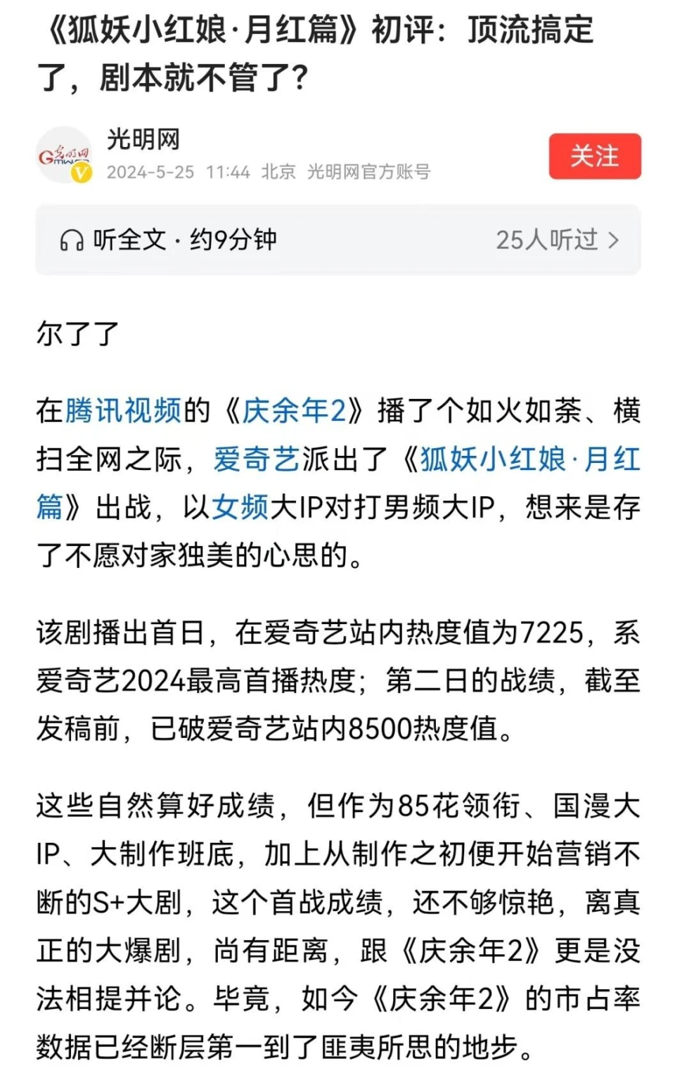 《狐妖小红娘·月红篇》已经播出好几天,不仅观众给出了第一波评价,人民文娱、光明网等官媒,也发文表现对这部剧的看法。 外貌上看,人民文娱和光明网对这部剧的看法一褒一贬。 但过细一品,才懂人民文娱没说的话,都在杨幂那场“吃红薯”的戏中。 人民文娱夸这部剧弘扬传统文化,人物设定有侠义之气,还加入了苏绣、仙居花灯制作、油纸伞等非物质文化遗产。 这一点确实云云。 剧中的每个场景的设置都很精良,好比东方月初的小屋,被许多网友称为“梦中情屋”,涂山的景致,每一帧都美到可以当壁纸。 这部剧在东方美学和传统文化上,确实做得不错。 但一部剧,只要场景美、有传统文化特色,就可以了吗? 人民文娱没有评价其他方面,但它没美意思说的话,都在光明网转发汹涌新闻的这篇文章中。 文中观点非常犀利。 “这部剧跟《庆余年2》的播放数据没法相提并论。” “脚本属于中等偏下程度,事儿能讲明白,但没什么亮点。” “男女主情绪推进方面,缺乏让人眼前一亮、心头一动的精彩互动。” 从我自己的观剧感受来看,这些看似直白的评价,其实还是挺中肯的。 关于演员和演技,这篇批评中没有过多品评,只说“表演尚在框架之内,不外不失(但也毫无可吹之处)”。 但假如各人看过杨幂和龚俊吃红薯的这段戏,就会发现,这部剧的表演,也有不少标题。 这段戏的配景,是东方月初给涂山红红烤红薯吃,一边自己大口大口吃红薯,一边眼巴巴地期待涂山红红能喜欢吃他烤的红薯。 究竟东方月初追涂山红红的有力本领,便是厨艺。 从烤鸡到烤红薯,先拿捏涂山红红的胃,再捕获她的心。 龚俊几口就把红薯吃到只剩皮,表现出了东方月初喜欢吃,而且为自己的技能而自豪的样子。 但杨幂只伸开嘴虚空吃了一口,然后凑近红薯,沾了一下嘴唇,然后表现红薯很好吃。 网友辣评,“杨幂为什么要亲红薯?” “吃一口红薯,能怎么样?” 其实,杨幂演吃戏时,并不是不停假吃。 《哈尔滨一九四四》中,有一场关雪(杨幂饰)和老金(沙宝亮饰)吃暖锅的戏份,杨幂就是在真吃,一口肉一口菜,还不鉴戒把调料溅到了衣服上(花絮里有)。 为什么同样一场吃戏,偶尔真吃,偶尔假吃? 是食品的标题,还是导演要求的松紧程度差别? 更让人难以担当的是,这段穿帮的吃戏,不是网友从正面镜头里“鸡蛋挑骨头”,而是用侧面镜头,毫不粉饰地展示出来的。 任何一个认真看剧的人,都能看到杨幂假吃时,嘴跟红薯离得老远,根本用不着八倍镜放大看。 一样平常演员假吃的戏份,剧中都会给正面镜头,这样不会容易被观众发现“假吃”。 但《狐妖小红娘·月红篇》,为啥偏偏拍“假吃”的侧面镜头,把长达3s的穿帮镜头,递到观众的眼皮子底下? 是导演拍这个镜头时,就没过细看细节? 剪辑时,也没发现假吃? 后期制作、梳理全片时,也没人认真查抄? 从现场拍摄,到后期制作,肯定有许多人浏览过这个片断,但竟然没人发现这个标题。 是因为各人把精神都放在磨皮加滤镜上了? 还是故意放这个“假吃”镜头,以黑杨幂为代价,给剧增加热度? 不管真实缘故起因是怎样的,能肯定的是,剧方并没有用充足认真的态度对待这部剧。 否则,怎么也不会放出这种镜头。 一部好剧,脚本和演技才是根本,就算0宣发,好口碑也会一传十十传百。 若把大部门精神都放在宣发和敲定流量演员上,忽略了脚本和演技,只会舍本逐末,浪费天价投资。 |