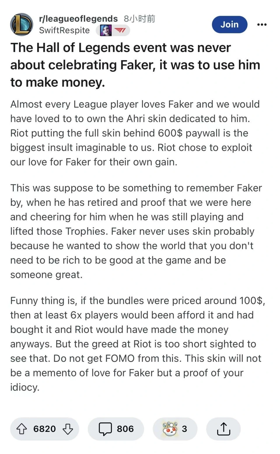 自从官宣Faker是第一位入选名人堂的选手后,许多人就在等候他的名人堂皮肤,究竟当初让Faker放弃了狐狸的冠军皮肤,改做名人堂皮肤,许多人都对于这款皮肤的最终呈现结果抱有非常大的等候。就在28号,官方正式公布Faker名人堂皮肤有2款,分别是阿狸和妖姬,但是很快公布的售价引发了大量的争议。 详细的环境如下,根据外媒爆料,Faker名人堂阿狸皮肤将退出3个格局,分别是平常款,售价在5430RP,差不多是325元人民币;进阶款售价32430RP,差不多是1942元人民币;以及末了的署名款,售价是59260RP,差不多是3550元人民币。 知道名人堂皮肤的售价不会低,但是没想到这么高,乃至在海外论坛,都有网友直接发帖吐槽:名人堂皮肤并不是为了庆祝Faker,而是为了利用他来赚钱。而且这位网友也直接怒斥:把代价定在600美元左右,是对玩家最大的欺侮,是在利用玩家们对Faker的喜好来为自己谋利,这款皮肤本应是Faker退役后用来怀念他的,Faker本来就是一个不喜好使用皮肤的选手,他大概想要证实,纵然你不是那么富有,你也能在游戏中表现精彩,成为一个巨大的选手,但是Riot太贪心短视了。 这个帖子在海外得到了大量的支持,不少海外网友也表示Faker是险些从未使用过皮肤的选手,但是官方决定用最昂贵的皮肤,来致敬他,这自己就是一种讽刺。也有许多T1粉丝不满,认为许多人都在等候Faker的阿狸皮肤,本来以为冠军皮肤会选阿狸,许多人都很高兴,没想到这么贵的代价,制止了许多粉丝购买的想法。 本来是万众等候的名人堂皮肤,现在闹成这副样子,险些每个赛区的观众都很不满,在疯狂吐槽,真的是功德办坏。估计Faker本人看到代价都舍不得购买吧,而外服也回应了关于名人堂皮肤的一些质疑,表示:选手和战队会拿到30%的分成,名人堂皮肤是限时售卖的,不会复刻。别的外服也表示任安在一级联赛打了超过5年以上的选手,都有时机成为名人堂的候选人。 一款皮肤卖3000多块,对于任何赛区的玩家来说都浮夸了,固然也大概有一些特别喜好和支持Faker的人会选择斥巨资购买,表达自己的心意。而且3000多块现在也只是外服的代价,国服的代价按照往常来看,感觉只会更高。本来许多人应该都有购买的激动,但是看到这个代价后估计都放弃了,先等皮肤出来后看看贩卖环境吧,如果背面的名人堂皮肤都这么贵,感觉真要被吐槽吃相难看了。 那么,对于这件事故,你们有什么想说的吗?你们会购买Faker的名人堂皮肤吗?欢迎在品评区留言探讨。 |