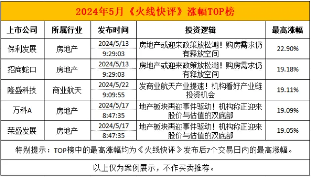 火线时机,深度快评!各人好,我是小财神。 5月伊始,大盘以强劲的开局给投资者带来了一抹亮色,仿佛预示着一个布满盼望的月份。然而,随着时间的推进,整个5月的行情却像一场戏剧,让投资者们不禁摇头叹息。上证指数犹如过山车一样平常冲高回落,市场整体出现调解态势,上证指数、深证成指5月份分别下跌了0.58%、2.32%。 尽管市场整体略显疲态,但却有一些行业和板块,依附政策的东风或庞大事件的推动,走出了独立行情。火线快评团队敏锐捕捉到了这些市场热门和相干板块的异动,相干个股也都有不错的涨幅,5月整体选股胜率达到了75%。下面就来给各人复盘一下。 5月最热门的板块,当属房地产。《火线快评》5月涨幅TOP榜前5名中,房地产板块就占据了4个席位。 房地产:保利发展,7日内最高涨幅22.90%5月9日,杭州、西安接连公布取消住房限购政策。专业人士推测,5月开始各地将迎来一波有数的政策放松潮。 火线快评团队联合行情异动及时跟踪资讯,5月13日09:29独家梳理了房地产相干的投资逻辑和相干上市公司。 而房地产行业也如市场预期,在5月份一连火热,相干个股出现了普涨行情。此中,保利发展在资讯发布后股价连涨数日,7个生意业务日内,最高涨幅达22.90%。 贸易航天:隆盛科技,6日内最高涨幅19.11%5月21日,相干媒体报道银河航天与合作搭档泰国马汉科理工大学,初次在泰国实现低轨卫星互联网宽带通讯网络试验验证。 火线快评及时跟踪资讯,于5月22日09:09独家梳理了贸易航天的投资逻辑和相干概念股。 而资讯中提到的个股也不负众望,隆盛科技在资讯发布后当天大涨18.95%,在随后的6个生意业务日内最高涨幅达19.11%。 房地产:万科A,4日内最高涨幅19.09%国务院消息办公室于2024年5月17日下午4时,举行国务院政策例行吹风会,请住房城乡创建部等相干部委负责人,介绍切实做好保交房工作配套政策有关情况。 在这一热门事件驱动下,火线快评团队赶在聚会会议召开当天开盘前,也就是5月17日08:47,再次梳理了房地产行业的投资逻辑和相干个股。 万科A在资讯发布当日就大涨10%,在随后的4个生意业务日内最高涨幅达19.09%,体现非常优秀。 5月行情已经结束。近来有看到观点称:由于7月有紧张聚会会议,6月的股市行情估计不错。那么,市场真的能如各人所愿吗? |