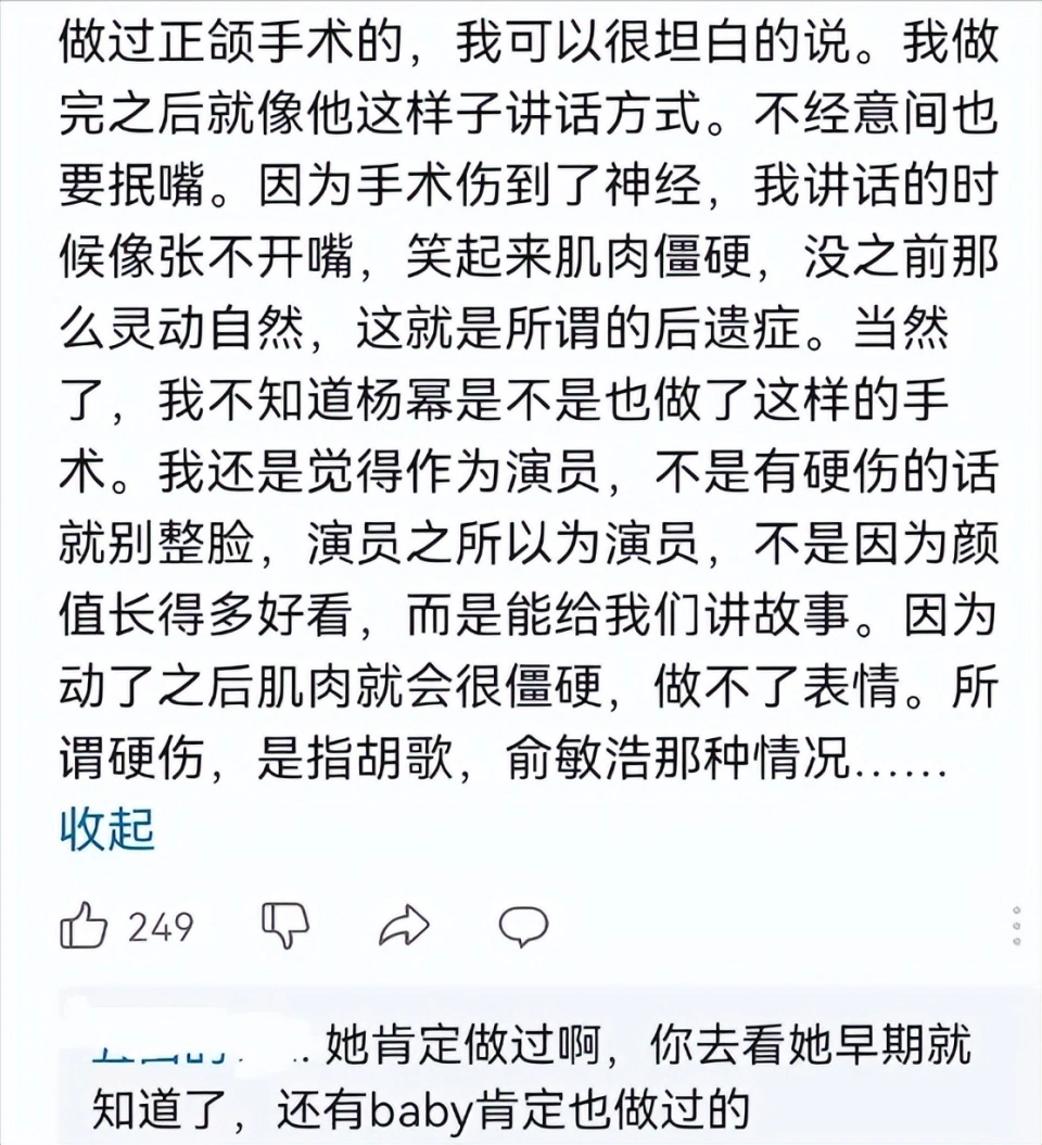 自从女星唐嫣入围白玉兰最佳女主角之后,她的好姐妹杨幂随之被推到风口浪尖。不但是演技遭受质疑,还有一些心情习惯也被具体解读分析,引发了热议。 从《哈尔滨1944》到现在播出的《狐妖小红娘·月红篇》,杨幂的两部新作口碑都不理想,大众质疑的核心都集中在她的演技上。对此,还有网友用生理分析的方式,推测杨幂之以是演技不可,重要由于她遭受了爱情和友谊的双重反叛,导致她难以融入脚色的感情之中。 这种解读看似谬妄,确实也反映出杨幂现在的演技状态——无法感动观众,也难以感动自己。 其次是杨幂在剧中的心情习惯太抓马,那就是幂式抿嘴演技T媚课说完台词,都要抿一下嘴。而且她的这种小习惯已经乐成转移了观众的聚核心,导致大众无心入戏,反而都紧盯着她的嘴。 就连偕行也曾指出杨幂的抿嘴问题,对方以为这是杨幂只顾着美美哒,而不管演绎效果。 除了吐槽声以外,更多网友在质疑杨幂何时养成的这个习惯。有人表现杨幂早在《三生三世十里桃花》中就已经如许了,只是当时她的脸部还不算太僵,很容易被观众忽略。在之后的《暴风眼》中,杨幂嘴唇上的小动作就变得越发显着,让观众很难视而不见。 就连杨幂正在拍摄的转型大剧,也让粉丝为她的抿嘴演技捏一把汗,期盼杨幂可以有所改善。根据她在各个剧中的表现,这个抿嘴的习惯可能并非只是演技上的小动作,可骇的是,这可能来自生理上的某种客观缘故原由,不是没发现问题,而是难以改变。 关于“抿嘴演技”的成因,一些网友以为是整牙的效果,为了整洁牙齿,效果造成嘴唇内收,就会出现爱抿嘴的习惯。 尚有做过医美的网友表现,只要做过正颌手术的都会出现这种问题,这是由于手术伤及神经,导致发言时无法伸开嘴,连带着笑脸也变得僵硬,这些问题正是所谓的医美后遗症。只管不知杨幂是否做过微调或医美,可她现在的种种表现恰好符合网友所说的症状。这个症状是很难改善的。 这里也不得不说一句,至心奉劝在演艺事业上有所寻求的明星能够少动脸,别一味为了所谓的红毯美丽而陷入畸形审美。脚色须要气力感,效果自己瘦得头大身小,脚色须要发作力,效果自己掐镜头找角度,终极融入不了脚色也难以表现作为演员的气力。 由于寻求所谓美丽,导致影响演技的明星不少。好比女星张檬,昔日依附《美民气计》中的一个镜头一炮走红,没有过多台词,但她纯净灵动的气质颇得民气。由于过分爱美的心,张檬开始了医美之路,效果没有让她越来越美,却因此失去了以往的天然灵动。 厥后在一档综艺节目中,张檬本人更是大方谈及此事,她直言非常悔恨进行整形,这一运动险些断送了她的演艺事业。这么一看,张檬是在用自己的切身材验来为内娱明星敲响警钟。 正如奥斯卡影后赞赏“皱纹是人生的一张地图”,女星咏梅曾经拒绝助理为她修图。若要成为好演员,必须要继续真实的自己,而不是盲目标医美和女神滤镜。杨幂现在的处境,某种水平也算是一种反噬,渴望后续她能够至心做出改变吧。 本文未经授权严禁转载违者必究! |