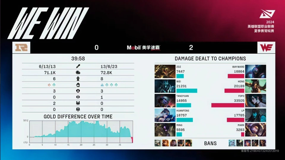 2024年对于好汉联盟电竞圈来说,是一个电竞大年,LPL夏日赛于6月1日儿童节当天,战火重燃。LPL赛区在这个夏日赛期间,大刀阔斧的举行了全面革新——全新的赛制,全新的BP模式,以及全新的阵容。坦率地讲,至少囧王者以为这个赛季,很值得一看。 在率先竣事的第一天的角逐中,Up和NIP都打满三局的击败了各自的对手。仔细的玩家在直播中,应该不难发现,全新的无畏征召模式中,无论是战队照旧选手,都表现出了差别于春季赛的打法和战术。这就很磨练选手和赛训组的功底了! 按照赛程安排,6月2日也将安排两场角逐,分别是WE对阵RNG,以及核心之战RA大战TES。坦率地讲,这两场角逐,对于囧王者而言,着实都算是核心之战,一场是老牌权门之间的对决,一场是新贵之间的比力。然而惋惜的是,WE和RNG都由于各自的原因,导致了扫除。 第一局角逐,WE蓝色方,禁用佛耶戈、莉莉娅、岩雀、死歌、火男,选用斯卡纳、大树、小炮、娜美;RNG红色方,禁用兰博、艾希、彗、卡莉斯塔、德莱文,选用奎桑提、皎月、杰斯、韦鲁斯、泰坦 第一局角逐,WE选择了小炮中单的双射手的组合,他们必要发育,主打一个中后期团战;而RNG则是选择了杰斯为核心的斲丧流体系,他们在中期可以使用双C的Poke技能,来斲丧对手。 效果第一局角逐,两边仅在前10分钟打得比力胶着,12分钟左右,WE使用中路的线权上风,拿下中路一塔后就直接腾飞。今后不绝使用小炮的推塔上风,在边路获取防御塔并取得经济领先。17分钟左右,WE打出0换5团灭RNG之后,就奠基了胜局。终极25分54秒,WE在拿到大龙的环境下,一起横推,轻松赢下第一局! 第二局角逐,RNG蓝色方,禁用泰坦、兰博、竣事、蕾欧娜、青钢影,选用鳄鱼、死歌、小炮、艾希、牛头;WE红色方,禁用佛耶戈、蝎子、莉莉娅、卡牌、德莱文,选用贾克斯、豹女、彗、卡莉斯塔、呆板人 背水一战的RNG,在第二局角逐中选择了小炮中单,死歌打野的双AD阵容,前期节奏偏弱;而WE则是依靠于呆板人的控制。 效果第二局的节奏,是RNG得了EDG的病,他们在全场角逐的绝大多数时间内里,都掌控了场上的节奏并保持了经济克制,最高时一度打出了5000的经济上风。然而在进入大后期,完成经济克制的RNG,在拿到了两条大龙之后,反而不会打角逐了。特别是中单汤圆,他的小炮在关键团之前,来了一波让人看不懂的跳脸操作,效果把本身送到了WE的困绕圈,让RNG一整局的积极,直接白给!终极WE在40分内,完成逆天改命,零封RNG,拿到夏日赛开门红! 坦率地讲,看完RNG和WE的角逐之后,囧王者只想说,RNG鲲到这种田地,我是没有想到的。不到二非常钟,他们能领先5000的经济,分析他们前期打得非常不错。但是拿到两条龙后的RNG,为什么就不会打角逐了,是EDG附身?RNG,EDG和WE这御三家,是属于是闭环了吧? |