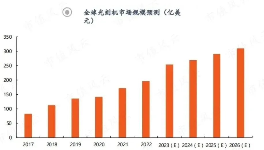 根据《半导体制造光刻机发展分析》数据推测,2017—2026年,全球光刻机市场规模将从约83亿美元增长到约310亿美元,总体出现稳固的上升趋势,其间复合增速约为15.8%。