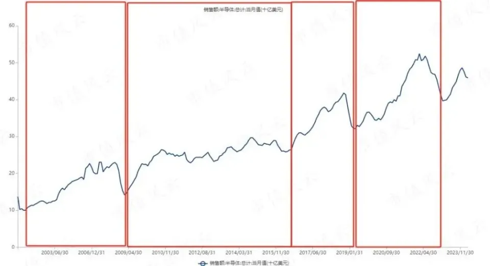 将全球半导体贩卖额拉长二十年来统计,我们可以发如今贩卖额稳步上升的过程中总是在波峰和波谷之间循环往复,近来两个循环周期显著收缩至2-3年。