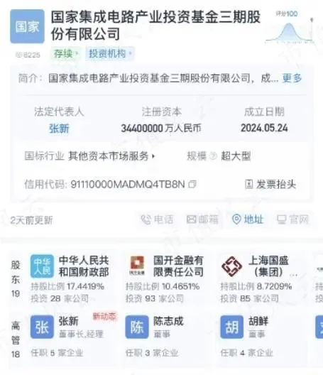 据天眼查显示,国家集成电路产业投资基金三期股份有限公司(国家大基金三期)于5月24日正式创建,注册资源达3440亿元。