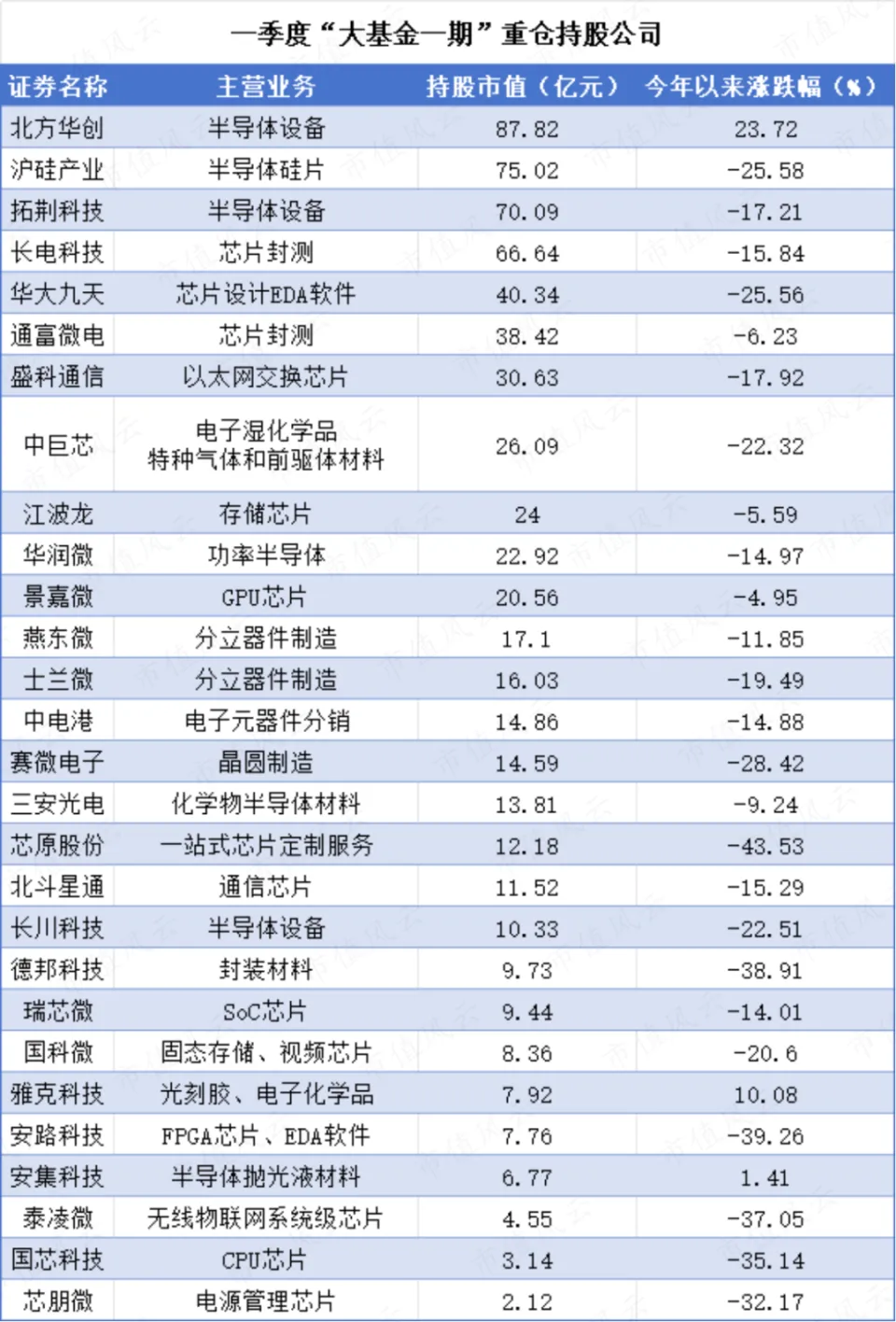 停止一季度,大基金一期重仓了北方华创(002371.SZ)、沪硅产业(688126.SH)、拓荆科技(688072.SH)等主营半导体装备公司。