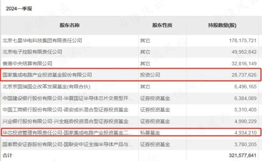 如一季度末,大基金一期和二期分别位列北方华创的第4大和第9大股东。